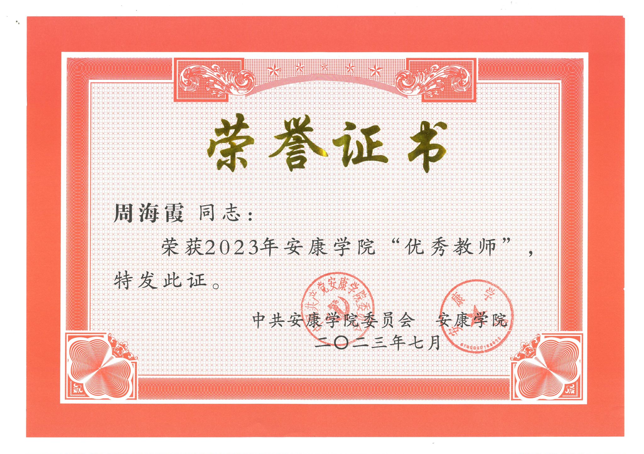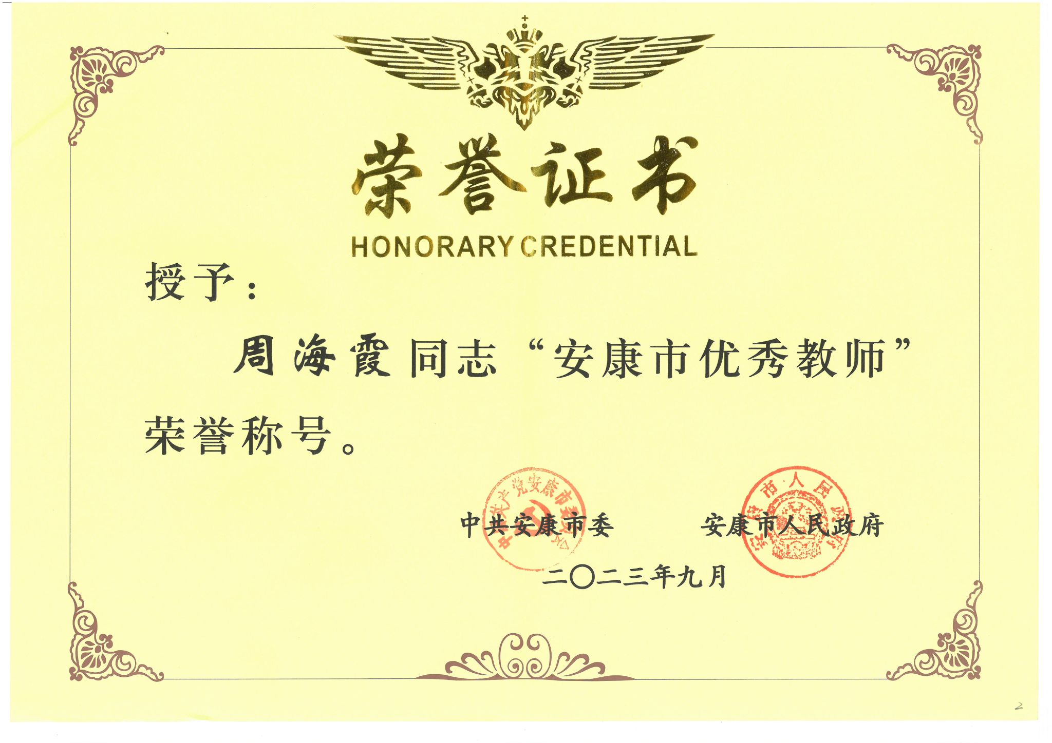 根据《关于推荐评选安康市教育工作先进集体和优秀教师、师德标兵、优秀班主任、先进教育工作者的通知》(安评组办发〔2023〕5号)精神和《BEAT365英国官网网站关于开展2023年校级教职工荣誉评选工作的通知》(党政办发〔2023〕16 号)相关要求,经个人申报、公司组织专家评审,公司教师周海霞被评为BEAT365英国官网网站优秀教师,同时被推荐参评安康市优秀教师,经安康市评审,确定周海霞为2023年安康市优秀教师。