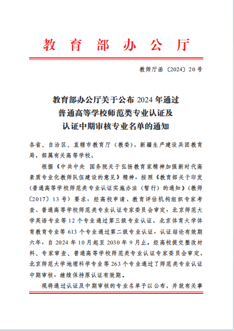 近日,教育部发布《关于公布2024年通过普通高等公司师范类专业认证及认证中期审核专业名单的通知》,beats365唯一官方网站汉语言文学专业顺利通过教育部中学语文教育二级认证,认证有效期六年。
