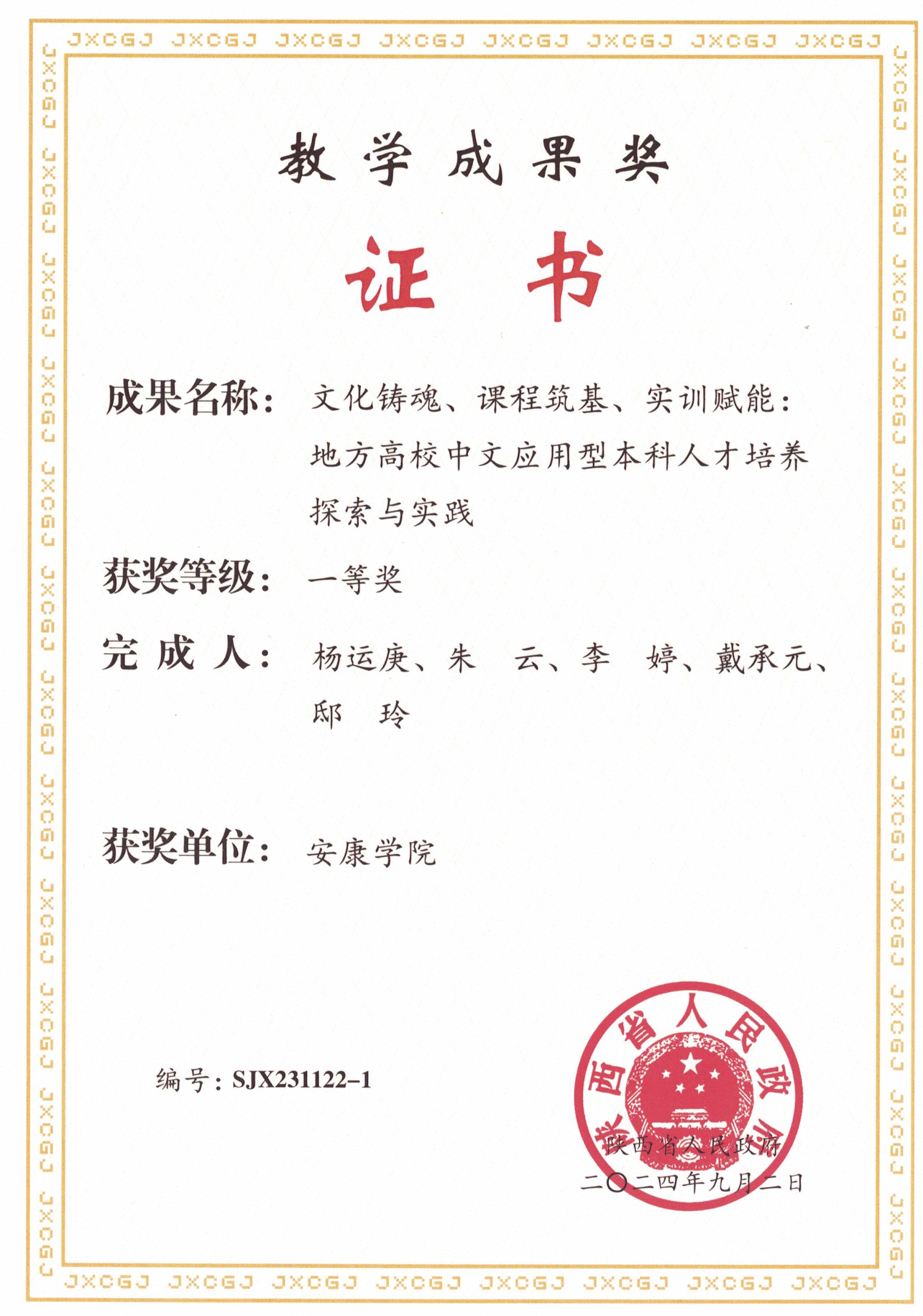 近日,陕西省人民政府发布了《陕西省人民政府办公厅关于表彰2023年高等公司产品成果奖获奖项目的通报》,beats365唯一官方网站杨运庚教授领衔申报的“文化铸魂、课程筑基、实训赋能:地方高校中文应用型本科人才培养探索与实践”荣获陕西省高等公司产品成果一等奖,获奖等次取得了新的重大突破,彰显了公司在中文应用型本科人才培养改革探索上取得的实效。