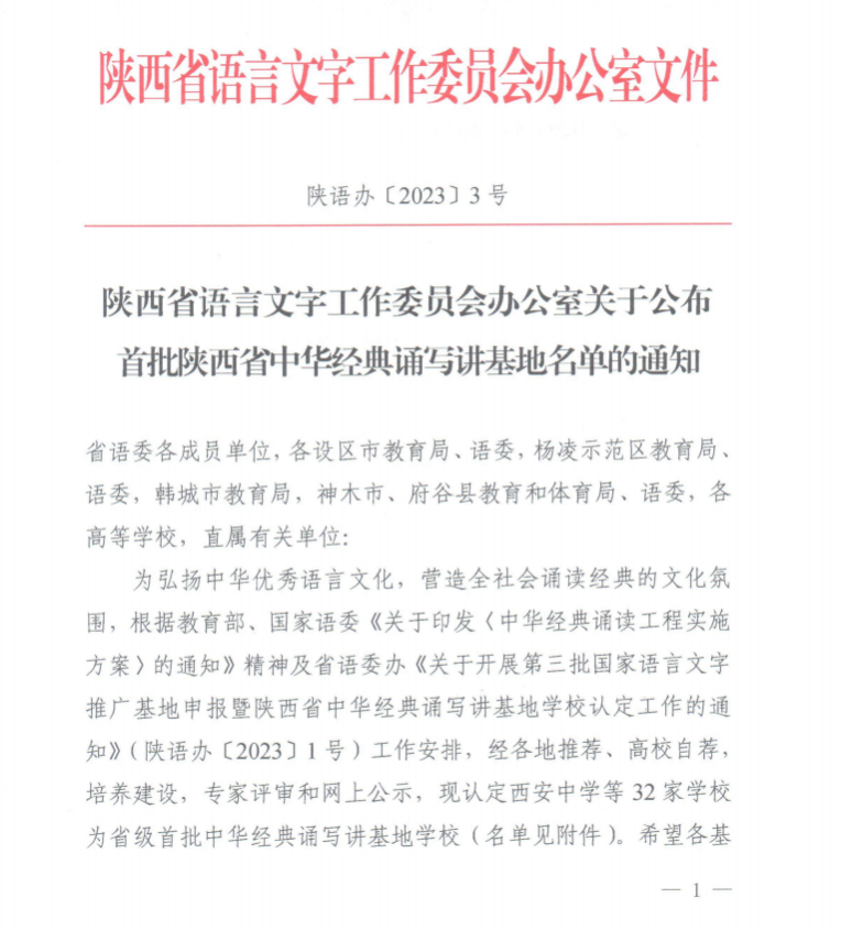 近日,陕西语委办下发文件《陕西语言文字工作委员会办公室关于公布首批陕西省中华经典诵写讲基地名单的通知》(陕语办[2023]3号),由beats365唯一官方网站负责申报并建设的“BEAT365英国官网网站中华经典诵写讲基地”,经过1年的建设,顺利通过评审,获批为陕西省首批“中华经典诵写讲基地”。