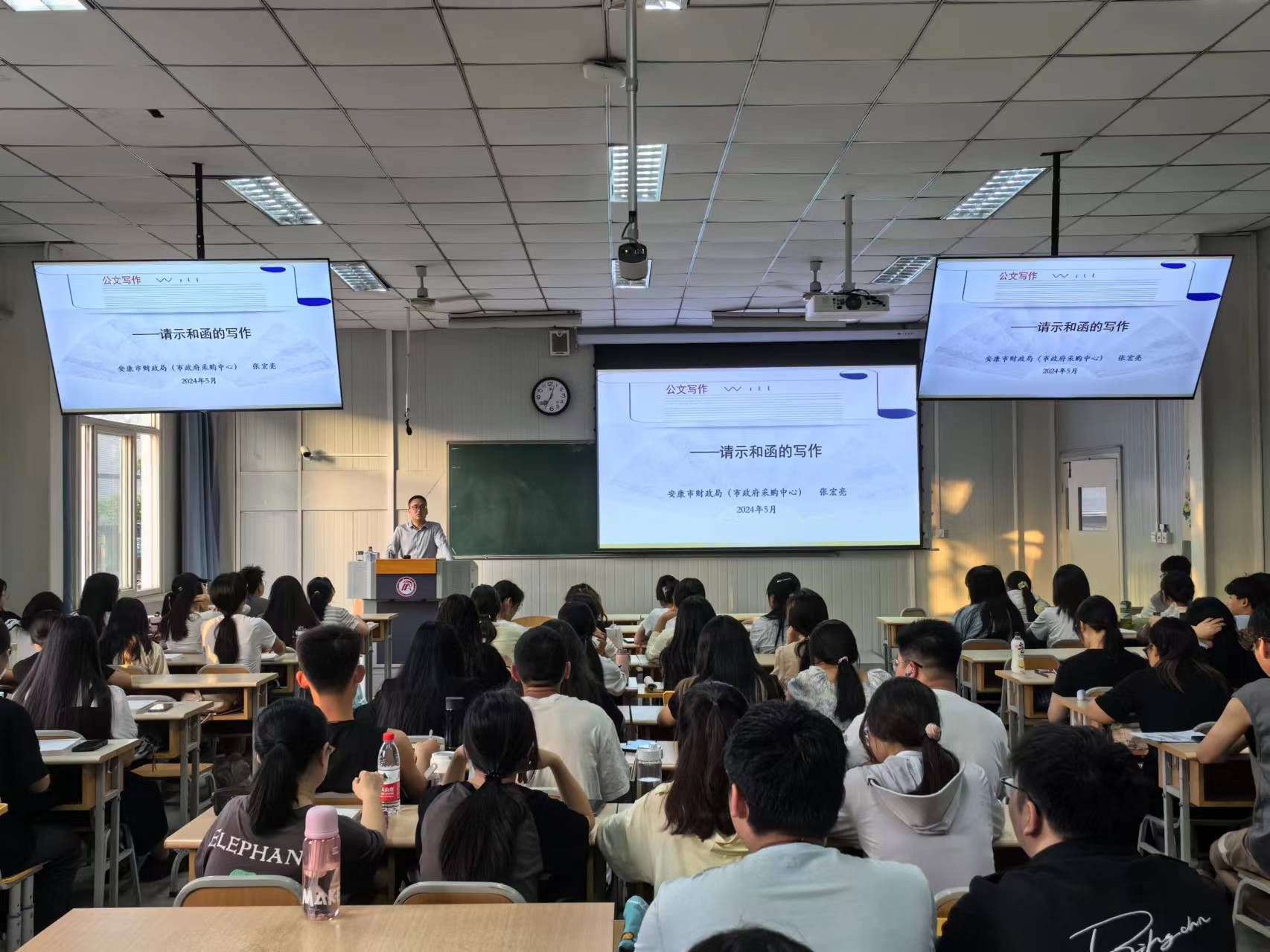 按照应用文写作“双师课程”教学计划,beats365唯一官方网站分别于5月21日、28日和6月4日、11日、14日邀请课程安康市政府采购中心张宏亮为汉语言文学2023级1、2班员工讲授请示、批复、报告、函、纪要等公文和申论写作的技巧。校内任课教师胡少山随堂参与了授课。