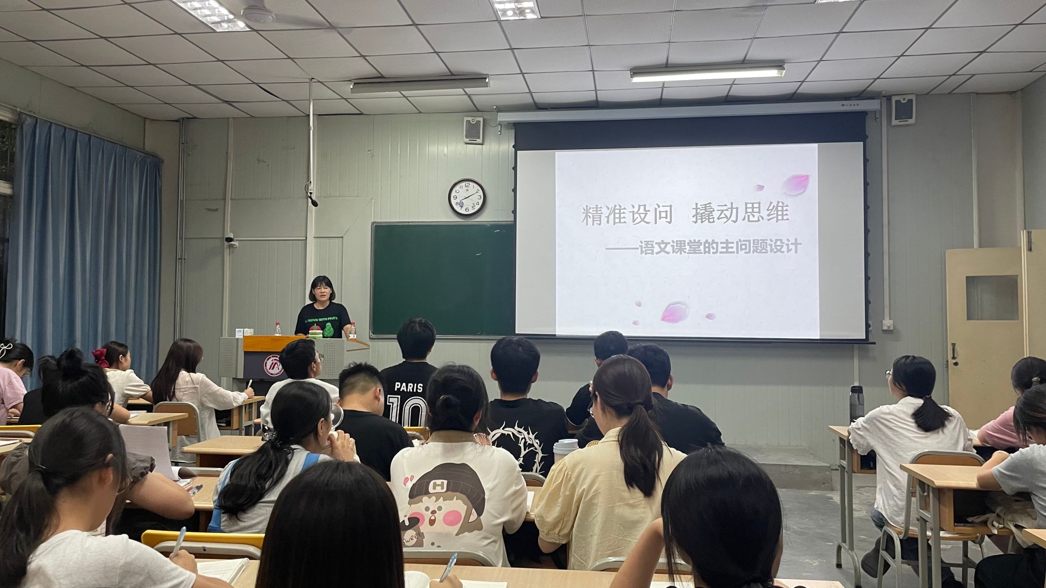 吉元丽老师深耕教学一线,有着20多年的教学经验,她结合自己一线的教学经验,以“敲响课堂第一锤——语文课堂的导入设计”与“精巧设问,撬动思维——语文课堂的主问题设计”为主题,围绕导入语设计的类型、导入语设计切入方法、主问题设计的切入点等内容展开讲解。她依据自身教学经验,结合名师优秀教学案例,通过展示《往事依依》《我的叔叔于勒》《爱莲说》《拿来主义》等经典导入、主问题设计案例,以《马说》为课堂实际练习,指出导入语设计要做到原则求“趣”、形式求“新”、内容求“巧”、方式求“活”、语言求“精”、钻研上求“深”;主问题设计上要发挥出主问题在教学中的“牵引力、支撑力、凝聚力、调节力”的作用。吉老师用生动丰富的课例和对教学的深入思考,让同学们收获满满,受益匪浅。