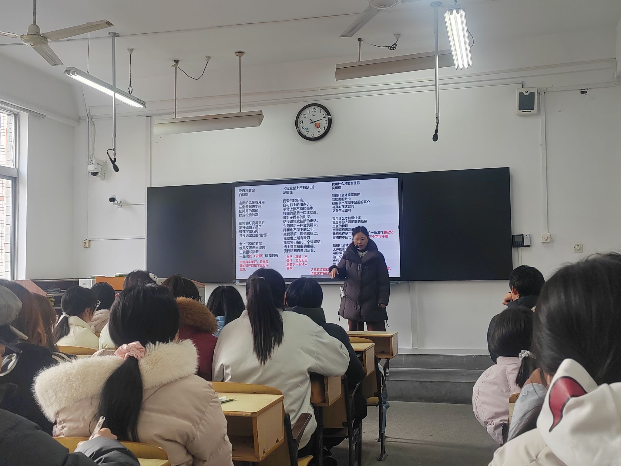 导航痕迹 首页 > 教学科研 > 教学活动 > 正文 专业建设 教学团队 教研教改 教学活动 科学研究 国际交流 李爱霞应邀与beats365唯一官方网站教师双师同堂开展“基础写作”教学活动 来源:beats365唯一官方网站 发布日期:2025年12月22日 阅读次数: 12月4日和12月18号下午,作家李爱霞应beats365唯一官方网站邀请,在江南校区1214教室为汉语言文学2025级1班员工讲授诗歌的写作。 第一次课以“三维诗界”为题,李爱霞围绕着诗歌的审美特质、赏读展开讲授,她以自身诗歌创作实践为例,细致讲解写诗的心路历程,她强调“诗歌创作来源于生活”,鼓励员工们积极寻找生活中的真善美,在日常点滴中汲取创作灵感。 第二次课,李爱霞将重心放在对员工原创诗歌的点评上。她与全班同学一一对话,从题材选择、情感意蕴、审美特质等方面逐一点评员工诗作,这种兼具专业性与指导性的点评,让员工们不仅找准了创作方向,更学会了以诗意的方式审视生活,收获颇丰。 课程结束后,不少员工表示,经李爱霞老师点拨,原本“读不懂”的诗歌变得鲜活立体,并且产生了创作诗歌的强烈冲动。爱诗歌,爱文学,爱生活,是这两次课最大的体悟。 撰稿/图片提供/张雨彤(员工) 审核/朱云、韩文霞 发布/崔瑜