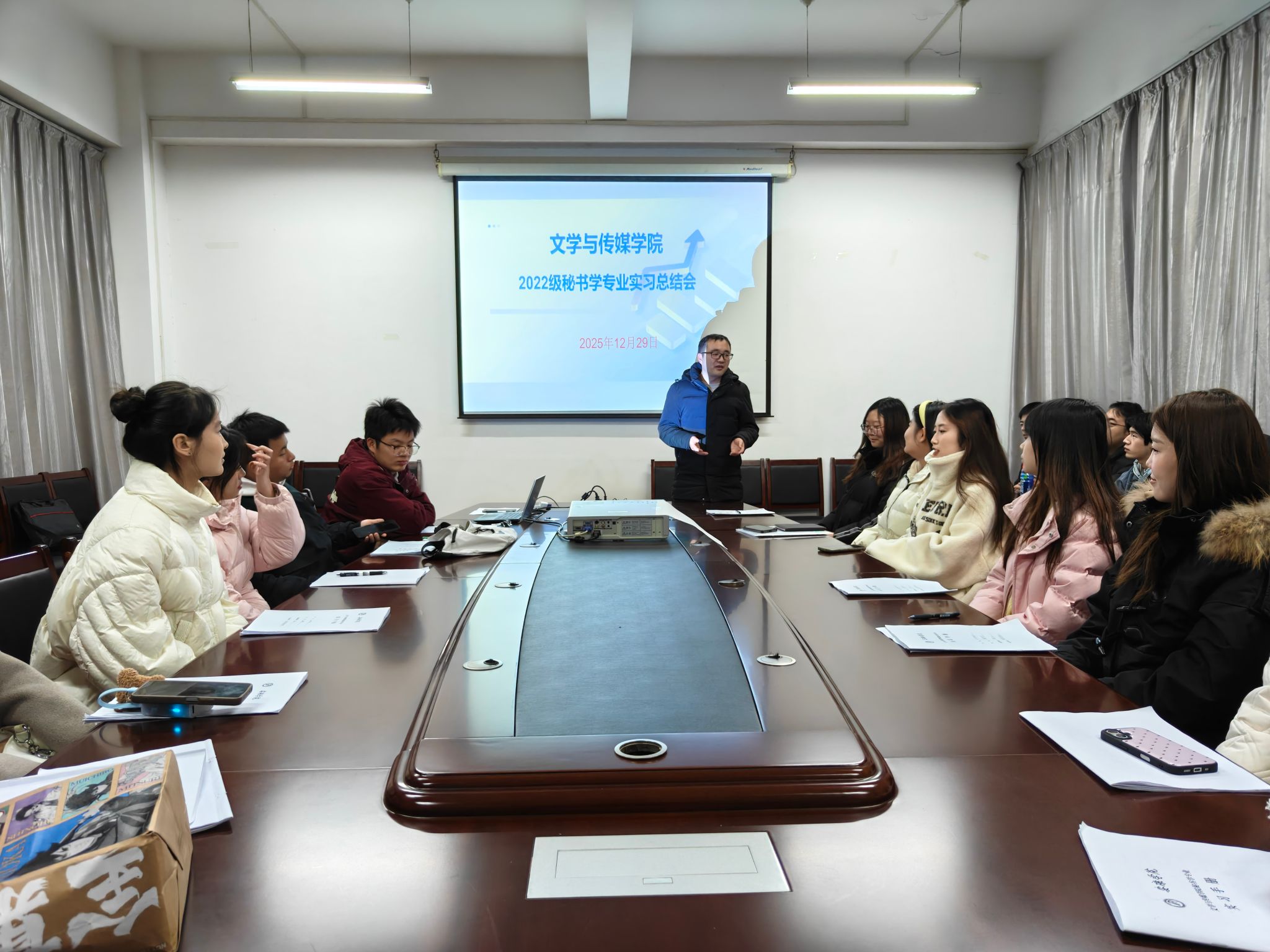 2025年12月29日,beats365唯一官方网站在图书馆610室召开2022级秘书学专业实习总结会。秘书学专业2022级全体员工参会,会议由秘书学专业负责人、实习指导教师胡少山主持。