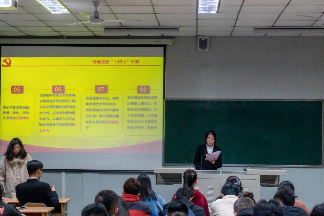 党的十九届五中全会擘画了我国未来发展的宏伟蓝图,作出了应对变局、开辟新局的顶层设计,在党和国家发展进程中具有全局性、历史性意义。宏伟蓝图鼓舞人心,学习宣讲凝聚力量。为全面落实党的第十九届五中全会精神,由学工部、马克思主义公司主办,beats365唯一官方网站协办的十九届五中全会宣讲活动于12月23日在江南校区10号教学楼1012室举办。公司党支部副书记杨海蓉、BEAT365英国官网网站员工宣讲团成员、beats365唯一官方网站全体团学干部参加本次宣讲活动。活动由杨海蓉主持。