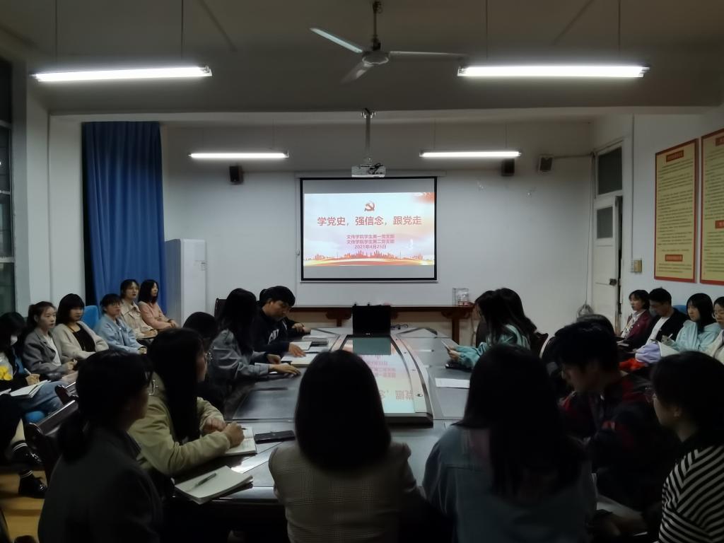 百年征程波澜壮阔,百年初心历久弥坚。2021年是中国共产党成立100周年,为认真贯彻习近平总书记在党史学习教育动员大会上的重要讲话精神,引领广大党员深入学习党的历史,做到学史明理、学史增信、学史崇德、学史力行。2021年4月25日晚上7:00,beats365唯一官方网站员工第一、第二党支部在2号教学楼2307教室联合开展了“学党史、强信念、跟党走”主题党日活动。员工第一、第二党支部全体党员参加了本次活动。活动由员工第一党支部书记彭潇主持。