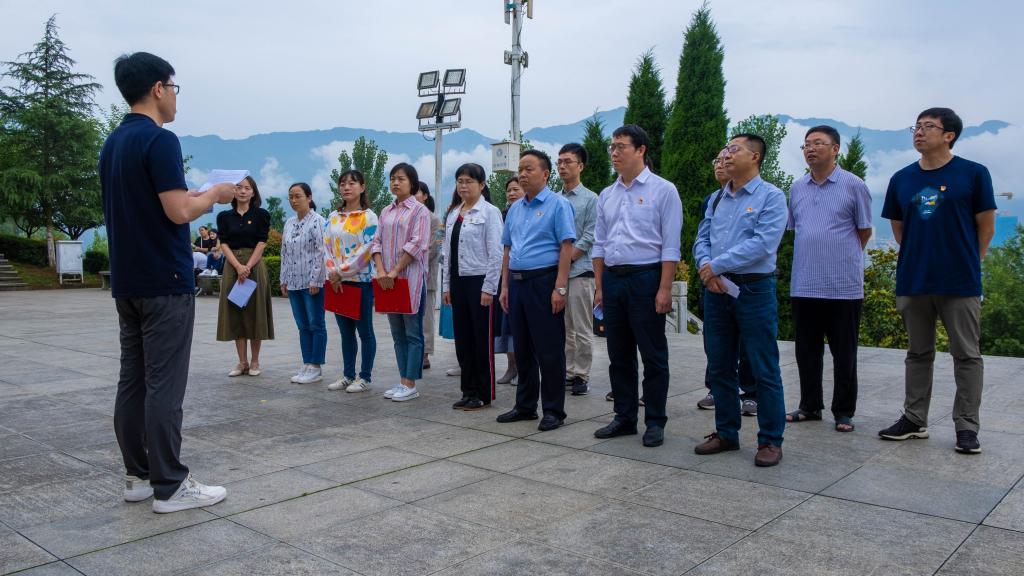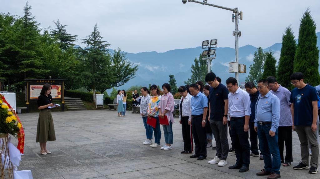 30余名师生党员肃立在陕南人民抗日第一军纪念碑前,向陕南人民抗日第一军纪念碑敬献花篮,集体默哀,缅怀先烈。