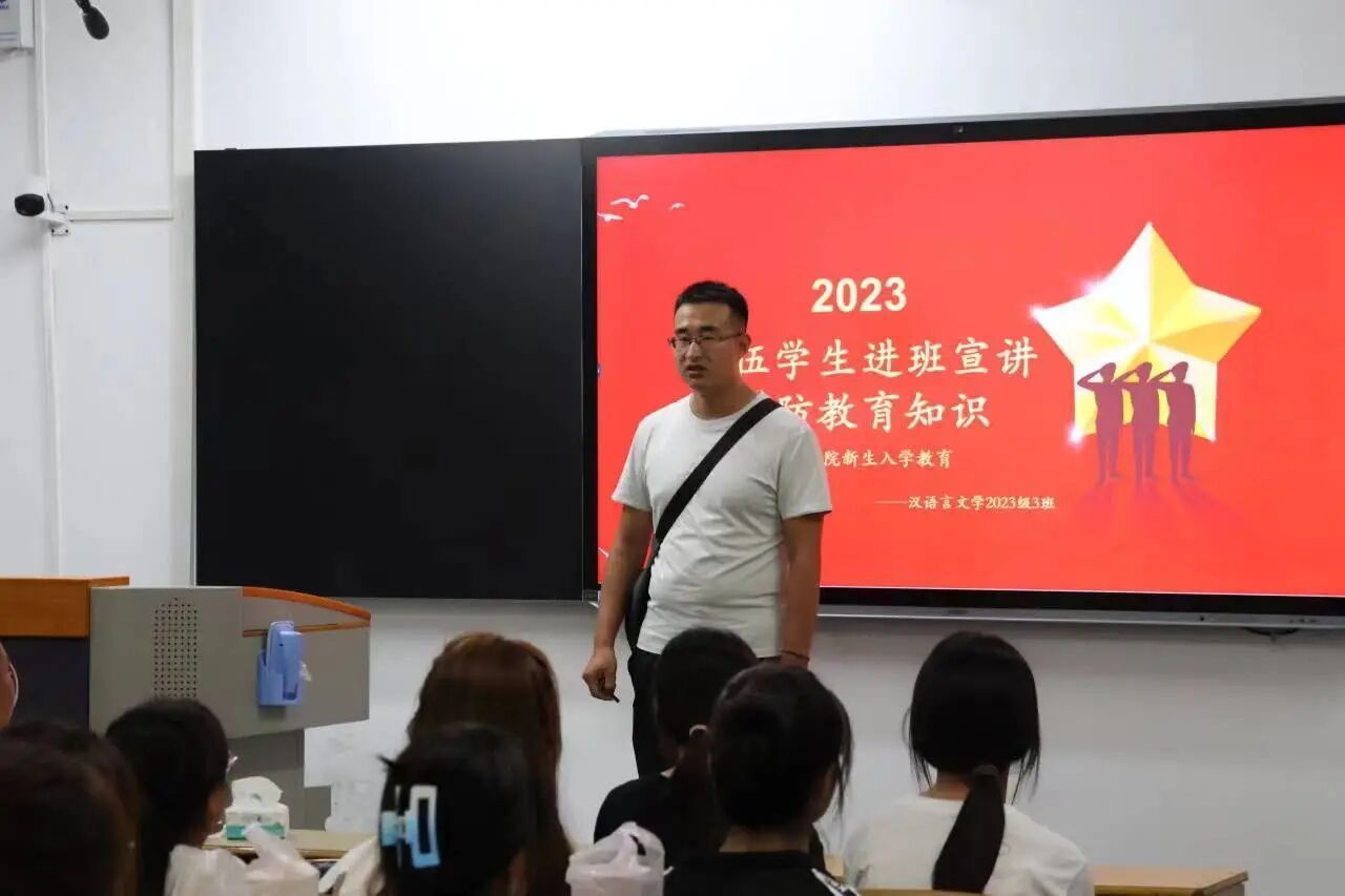 为引导广大青少年赓续红色血脉,树立国防意识,进一步贯彻落实习近平总书记关于加强全民国防教育的重要指示精神,9月12日下午,beats365唯一官方网站在一号教学楼举办国防教育知识宣讲暨新生入学教育讲座,并邀请退伍员工艾佳新、桑雪、严庆、刘寒龙、张振豫进入各班讲授,2023级全体新生参加此次活动。