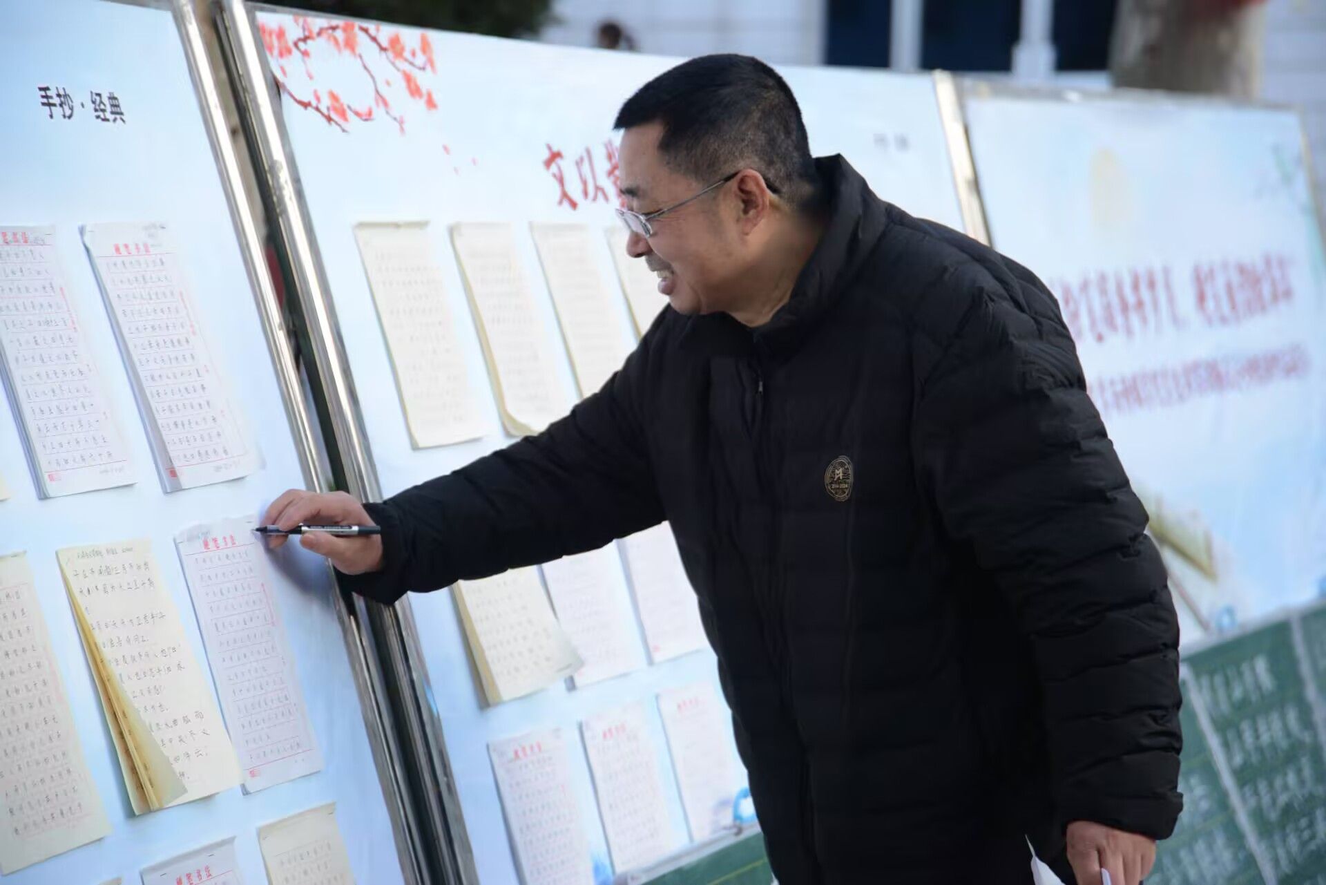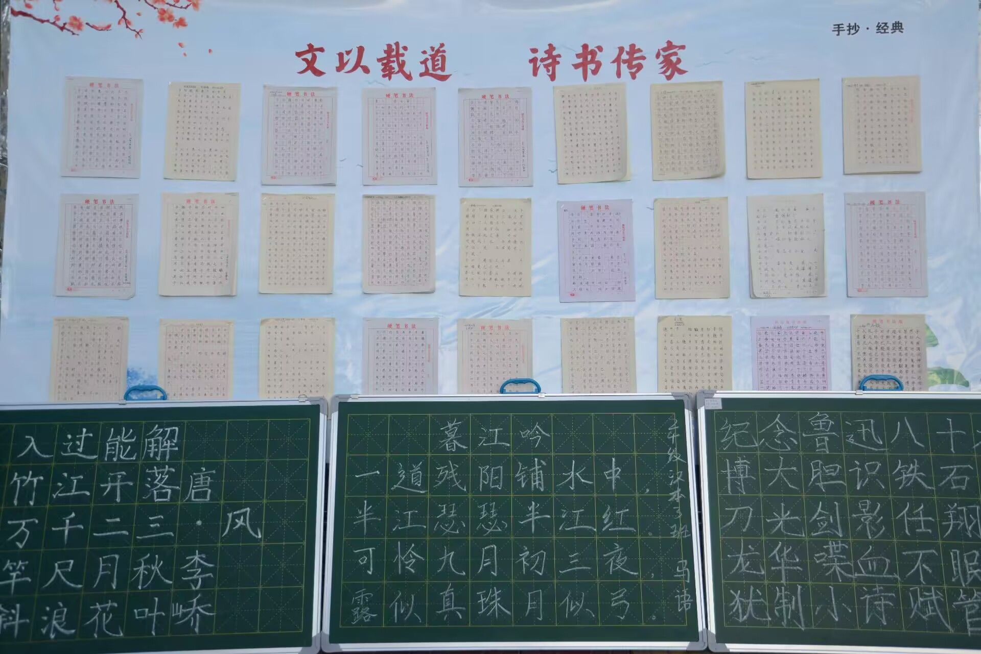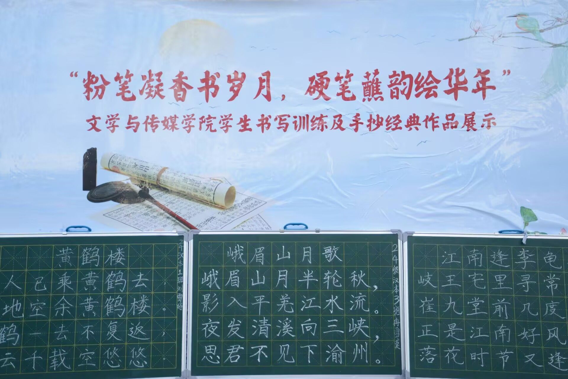 校园林荫道旁,粉笔字展示区的七言诗抄写精彩纷呈有的字体刚劲有力,如颜筋柳骨般气势恢宏,将七言诗的磅礴意境表现得淋漓尽致;有的则灵动飘逸,仿佛每一个笔画都随着诗句的韵律在黑板上翩翩起舞。无论是李白的豪放洒脱,还是杜甫的沉郁顿挫,都在员工们的粉笔字中得以生动呈现,引得过往师生纷纷驻足欣赏