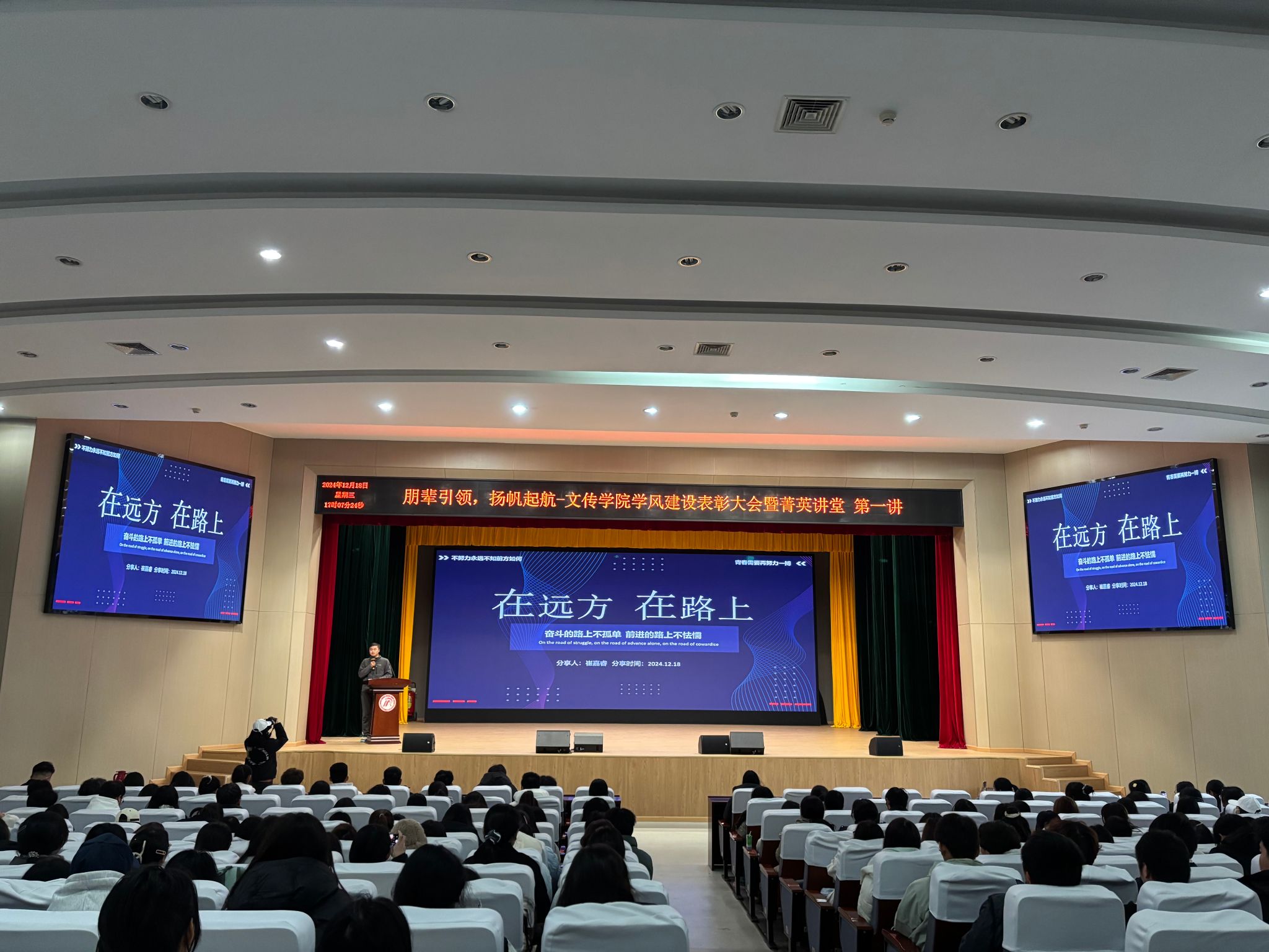 颁奖仪式后,员工代表们依次上台交流分享学习经验。汉语言文学2022级4班郑红阳围绕“大学平衡术”展开交流分享,她鼓励同学们积极实践、勇于试错,成就更好的自己。秘书学2022级1班王文康用幽默的语言分享他的“四小法宝”,激励大家拒绝“摆烂”心态,明确目标、立即行动。网络与新媒体2023级1班崔嘉睿通过亲身经历讲述“在远方 在路上”的感悟与体会,号召大家勇于实践,敢于担当,在学习和实践中提升自己的专业素养。