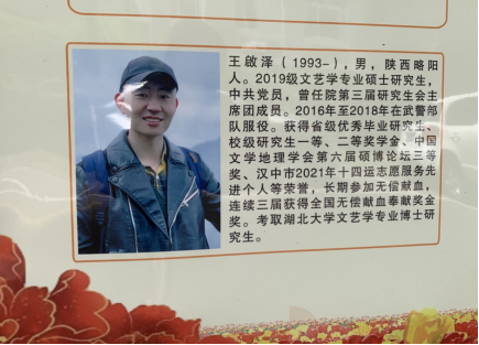 导语:王啟泽,男,陕西汉中人,2012年9月至2016年7月就读于best365英国在线体育官网汉语言文学专业,期间在李春平教授的指导下完成文学创作类毕业论文长篇小说写作(34万字);2016年9月应征入伍,在武警云南省总队昆明机动支队服役,期间两次获得优秀士兵荣誉称号;2018年9月退伍,同年12月参加全国硕士研究生入学考试,2019年9月入陕西理工大学人文公司攻读文艺学硕士学位,从事文学理论及批评方向的研究,2022年5月考取湖北大学文公司文艺学专业博士研究生。读研期间,王啟泽同学在《西安建筑科技大学学报》《陕西理工大学学报》《BEAT365英国官网网站学报》等学术期刊上公开发表论文6篇,主持申报并完成陕西理工大学研究生创新基金项目1项,参加中国文学地理学会第六届硕博论坛获三等奖,担任陕西理工大学人文公司第三届研究生会主席,获评陕西省2022届优秀毕业研究生。