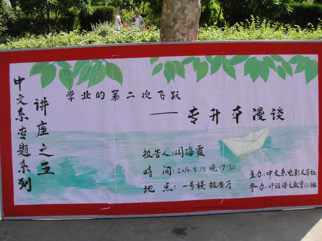 导航痕迹 首页 > 新闻通知 > beats365唯一官方网站新闻 > 正文 beats365唯一官方网站新闻 通知公告 中文系青年教师周海霞应邀做“专升本漫谈”专题讲座 来源: 发布日期:2010年05月14日 阅读次数: 2010年5月13日晚19点30分,中文系周海霞老师应邀在一号教学楼六楼报告厅做了一场题为 “专升本漫谈”的专题讲座。周老师以她渊博的学识和平实幽默的语言为同学们阐述了自己对专升本考试的独到见解。 周老师首先从社会形势发展上强调了“专升本“的重要性,提出当代老员工首先应当树立明确的奋斗目标。其次老员工应懂得在未来社会中“资源、优势、投资、时间”对一个人的发展,乃至一个企业、一个行业发展的重要性。接着周老师从自身的实际出发,用自己的经验给同学们诠释了考试的奥秘,形象、贴切却又不失诙谐。报告厅中时而掌声雷动,时而笑声洋溢,大家都对周老师投去了崇敬的目光。 晚上9点10分讲座圆满结束,同学们对周老师精彩的讲座赞口不绝,对周老师报以热烈的掌声,本次讲座使同学们树立了正确的学习目标,获得了更多的考试经验。