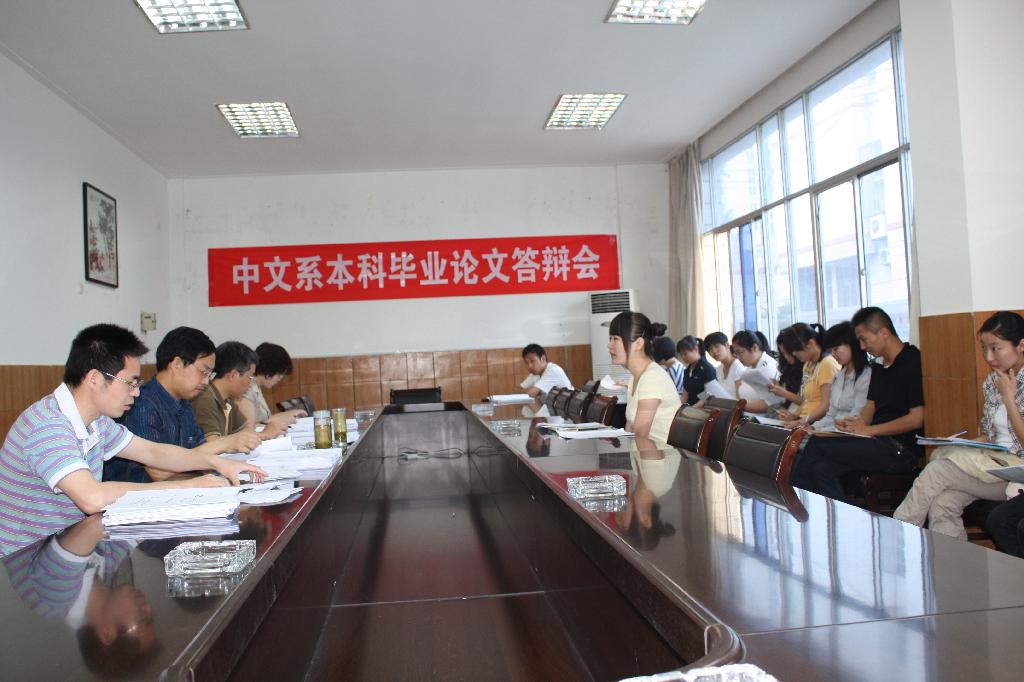 本次毕业论文答辩是中文系系史上规模最大、为时最长的一次毕业论文答辩:182名员工分八个答辩小组接受答辩,33名教师参与答辩或记录,整个答辩为时两天。整个答辩过程规范、严肃、认真。整个过程不得少于30分钟,答辩过程分为:作者介绍论文写作情况及论文基本思路、内容;主持人针对论文提出答辩基本问题;论文作者答辩;自由提问;主持人决定答辩是否通过、并当场告知答辩人;答辩小组评议、写出评语、确定论文档次五个阶段。07级汉语言文学专业本科员工、09级汉语言文学(专升本)员工全部参与了旁听。