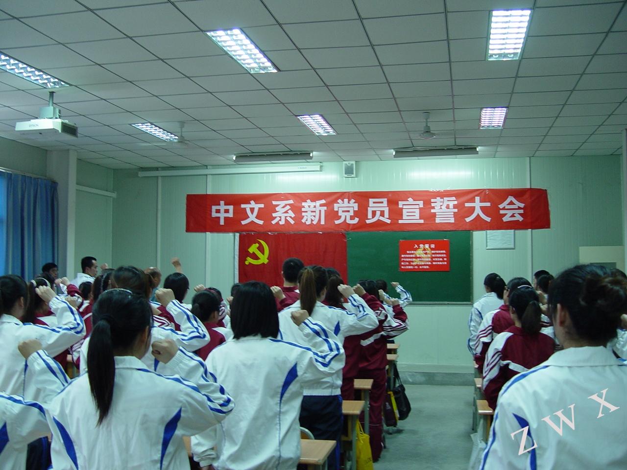 导航痕迹 首页 > 新闻通知 > beats365唯一官方网站新闻 > 正文 beats365唯一官方网站新闻 通知公告 中文系举行新党员宣誓仪式 来源:zwx 发布日期:2012年06月28日 阅读次数: 6月26日下午,中文系举行了庄严而隆重的新党员入党宣誓仪式。中文系党总支书记李岩、员工第一支部书记郝礼军、第二支部书记沈菲出席了本次宣誓仪式。 宣誓仪式上,员工第一支部书记郝礼军介绍了本次党员发展相关情况,新党员周曦孜代表本次新发展党员发言。 在庄严的气氛中,全体党员面对党旗庄严宣誓。 在宣誓仪式结束时,中文系党总支书记李岩对新党员提出了要求:一是认真履行党员义务;二是时刻牢记全心全意为人民服务的宗旨;三是时刻发挥模范带头作用,维护党的形象。 通过本次宣誓仪式,对本次新发展党员起到了很好的教育作用,加深了他们对党的认识,明白了党员应肩负的责任。