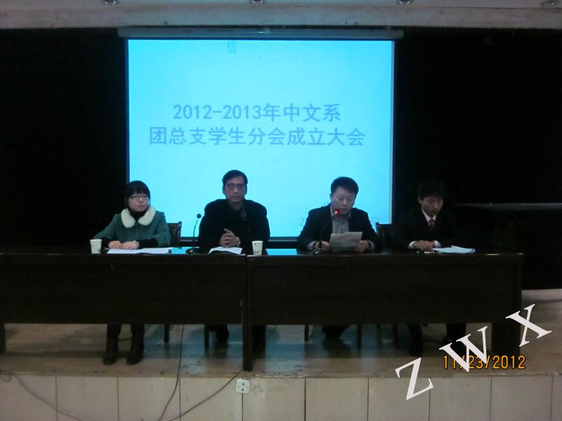 2012年11月23日晚8点,BEAT365英国官网网站中文系2012-2013学年度团总支员工分会成立大会在一号楼六楼报告厅正式举行。到会的有中文系党总支书记李岩、团总支书记沈菲;2011-2012学年度团总支员工分会主席团及各部部长、2012-2013学年度团总支员工分会主席团、各部部长及全体干事。成立大会在全体到会人员合唱国歌的旋律中拉开序幕。