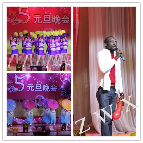 晚会在热闹、欢快的陕北民间歌舞中拉开帷幕。接着,优雅的华尔兹舞蹈、欢快的健美操、曼妙的古典舞蹈、劲爆的街舞轮滑、啦啦操次第登场。机关三支部余婕老师的一曲《知音》,引起观众对爱情的无限遐思;影视戏剧社的小品《退房》,再现了奋进的BEAT365英国官网网站人浓浓的师生情;职工倪士杰的新年祝福,表达了喀麦隆员工对中国的无限情怀;第五龙龙等人的诗歌朗诵《我的南方和北方》,激起了大家对伟大祖国的深深眷恋;“太极与双节棍”动与静的美妙组合,更是展示了中华武术的博大精深;史超凡、赵莎的英文歌舞,劲爆火辣;梁启超组合的自编歌曲,激情飞扬。整台晚会,高潮迭起,掌声、笑声、欢呼声不断,突出了“热闹祥和、青春激扬”的主题。