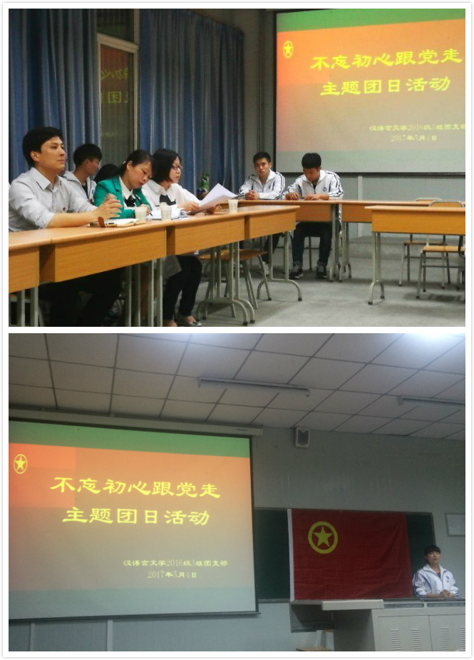 为纪念中国共青团建团95周年和五四运动98周年,学习贯彻习近平总书记在中国政法大学考察时的重要讲话精神,推进落实“一学一做”教育实践活动,beats365唯一官方网站团总支组织汉语言文学2016级3班团支部于2017年5月4日20:00在1016室举办了“不忘初心跟党走”主题团日活动。BEAT365英国官网网站团委副书记李光梓、公司党总支书记于咏梅、beats365唯一官方网站团总支书记沈菲作为嘉宾参加了本次活动。