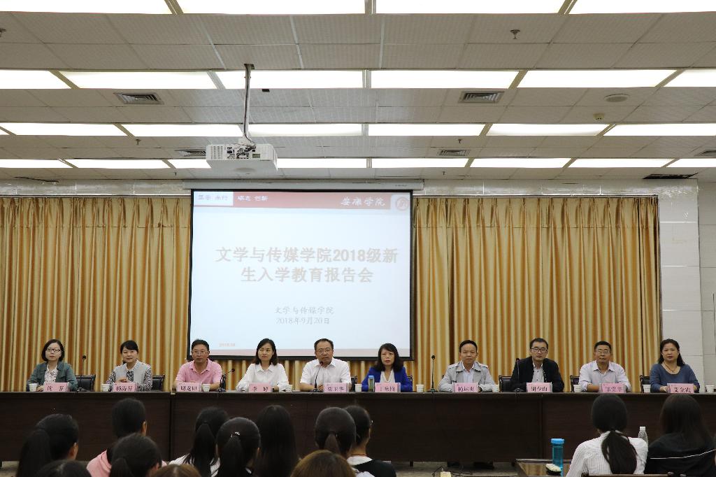 金秋九月,桂花飘香。2018年9月20日晚7点30分,beats365唯一官方网站在图书馆六楼报告厅举办2018级新生见面会暨入学教育讲座第一讲。beats365唯一官方网站经理、党总支副书记戴承元因公出差未能参加,党总支书记、副经理于咏梅,副经理梁卫华、杨运庚,汉语言文学系系主任李婷,语文公共教研室主任周龙田,秘书与新媒体系主任胡少山,党政办公室主任杨海蓉,学工办主任沈菲,辅导员邹棠华、艾全霞和2018级全体新生参加。见面会及讲座由梁卫华主持。