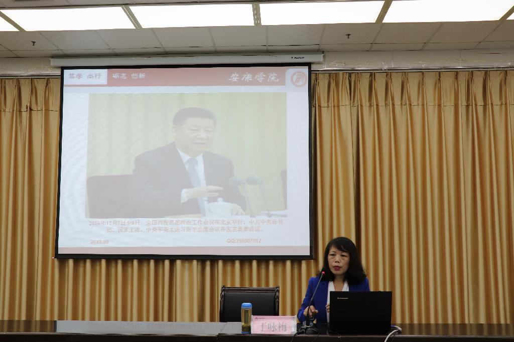 随后,她首先简要介绍了习近平总书记在全国高校思想政治工作会议上的讲话精神,会议精神要求高校应该围绕“立德树人”中心任务,贯彻落实“三全育人”,努力培养社会主义事业的合格建设者和可靠接班人;其次简要介绍了中国共产党第十九次全国代表大会的召开及会议主题和相关内容精神,重点对党章的修订进行了讲解。本次专题讲座重点围绕如何培养“中国特色社会主义可靠的接班人”从两个部分讲解。第一部分围绕“习近平勉励青年如何选择人生道路”的重要讲话要点切入,从调心态、树理想、能吃苦、勤学习、走好路五个方面进行了解读。她强调刚进入大学的同学们要迅速适应老员工活,一要努力调整各种心态,过好开学第一关;二要坚定理想信念,做到“爱国、爱家乡、爱父母”,理想指引人生方向,信念决定事业成败;三要肯吃苦,以青年时期的习近平总书记为榜样,读读《习近平的七年知青岁月》、《梁家河》这两本书,学、思、悟相结合,不怕经历摔打、挫折、考验,走好未来一生的路;四要学会勤于学习,善于学习,找到好的学习方法,学习是立身做人的永恒主题;五要学会走好路,紧跟时代浪潮,志存高远、勇于开拓,放飞人生梦想,在拼搏的青春中创造无愧于时代的人生。第二部分围绕“当代老员工如何锻造成为可靠的接班人”这一内容,从中国共产党从哪里来、谈谈信仰和说说党章三个方面进行阐述,重点引导员工学习了党的性质、党的指导思想等基本理论知识,对全体员工进行了入党启蒙教育,引导与会同学通过对党的基本理论知识的学习和了解,激发加入党组织的政治热情,从而不断端正入党动机,坚定共产主义理想信念。最后,于咏梅对加入党组织的具体流程以及如何撰写入党申请书进行了简单讲解,鼓励同学们积极递交入党申请书,争取早日成为一名入党积极分子。