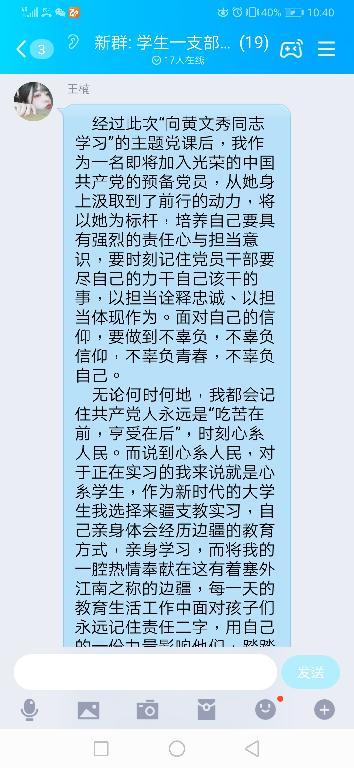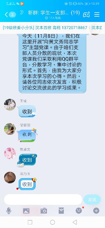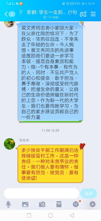 2019年11月8日15:00,根据上级党委通知要求,beats365唯一官方网站公司员工第一党支部利用QQ群网络平台,采取分散学习、集中讨论的形式举行了“向黄文秀同志学习”主题党日。本支部全体党员参加此次党日,由彭潇领学。