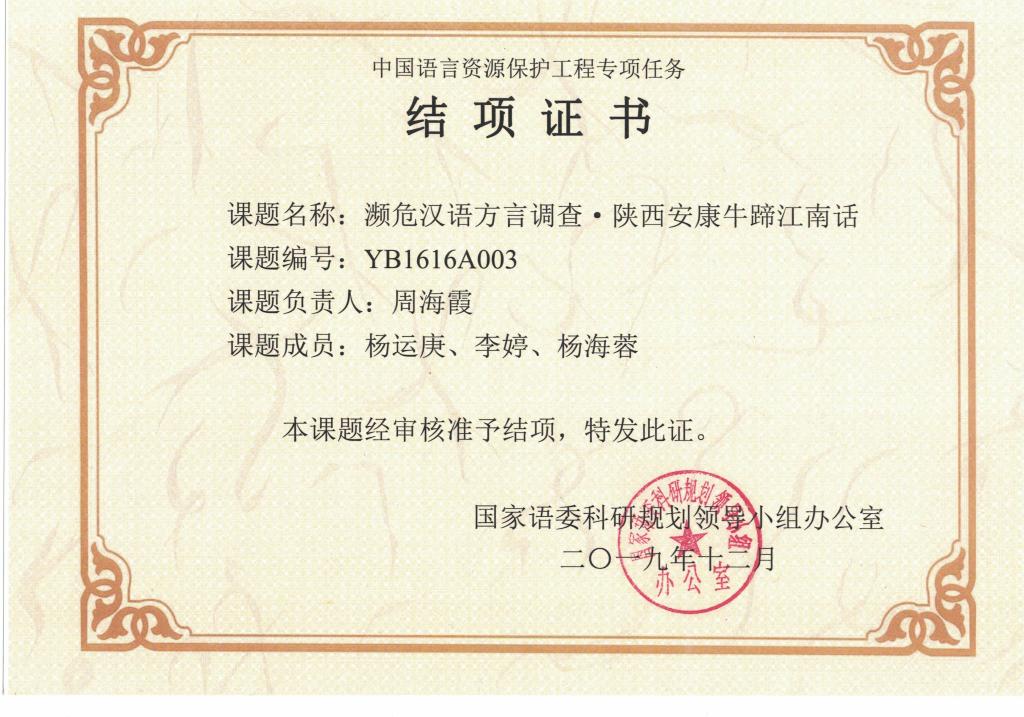 导航痕迹 首页 > 新闻通知 > beats365唯一官方网站新闻 > 正文 beats365唯一官方网站新闻 通知公告 beats365唯一官方网站教师周海霞主持的中国语言资源保护工程重点专项项目顺利结题 来源: 发布日期:2020年10月28日 阅读次数: 公司教师周海霞主持的中国语言资源保护工程重点专项项目“濒危汉语方言调查·陕西安康牛蹄江南话”顺利通过结题验收,音频、视频、文字资料全部合格并收入中国语言资源库。 “濒危汉语方言调查·陕西安康牛蹄江南话”项目2016年4月正式被国家语委科研规划领导小组办公室立项,到账经费18万元,牛蹄江南话也是本批中国语言资源保护工程项目确定列入的陕南范围内的唯一一个濒危汉语方言保护调查点。本项目研究历时三年六个月,项目成果录制音频、视频资料各3828条,收集方言民俗照片100余幅,形成方言志书文字材料30余万字。 撰稿/周海霞 审核/杨运庚 发布/崔瑜
