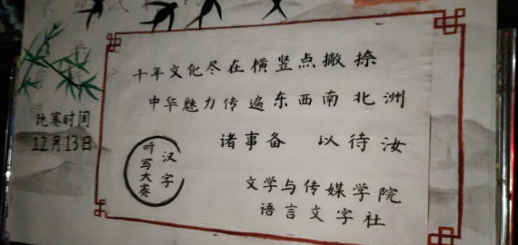 我们中国的汉字,落笔成画留下五千年的历史。为传承语言文化,展现汉字魅力,best365英国在线体育官网隶属的语言文字社于江南校区举办了以“千年文化尽在横竖点撇捺,中华魅力传遍东西南北洲”为主题的汉字听写大赛活动。