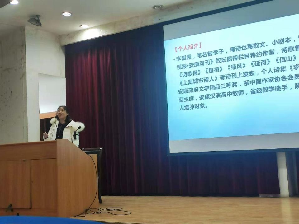 2020年12月14日晚7点,李爱霞老师应beats365唯一官方网站之邀,在江南校区1号教学楼报告厅为汉语言文学专业2020级员工讲授诗歌专题,同学们对李老师的到来表示热烈欢迎,基础写作课教师韩文霞全程参与教学活动。