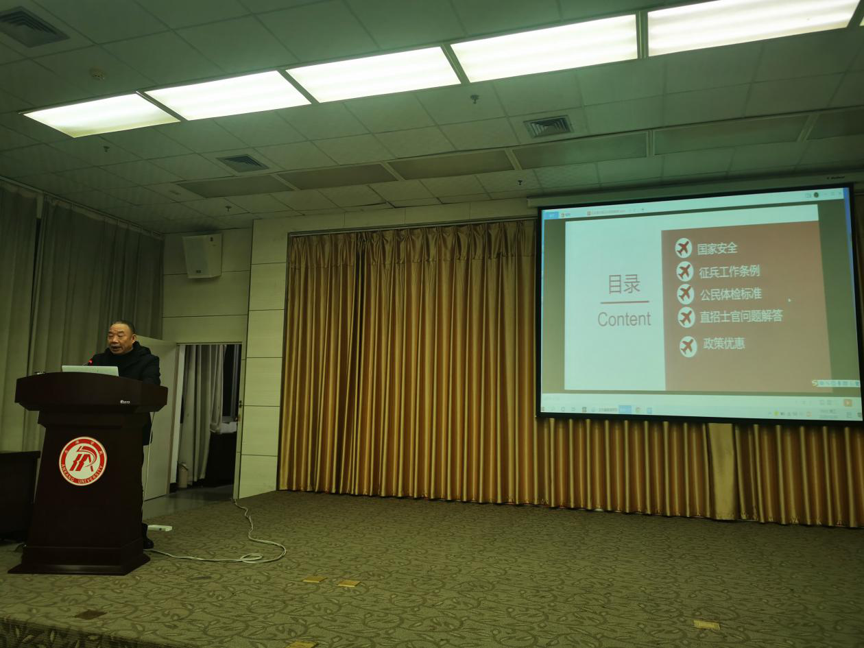 会议伊始,王瑞卫老师从相关法律对军人的优待政策、征兵工作条例、应征入伍体检标准、老员工应征入伍优惠政策、老员工应征入伍流程等六个方面向同学们进行了详细的讲解。他希望广大同学积极响应国家号召,抢抓机遇、迎接挑战,主动投身军营,让人生在实现强军梦中绽放绚丽光彩。