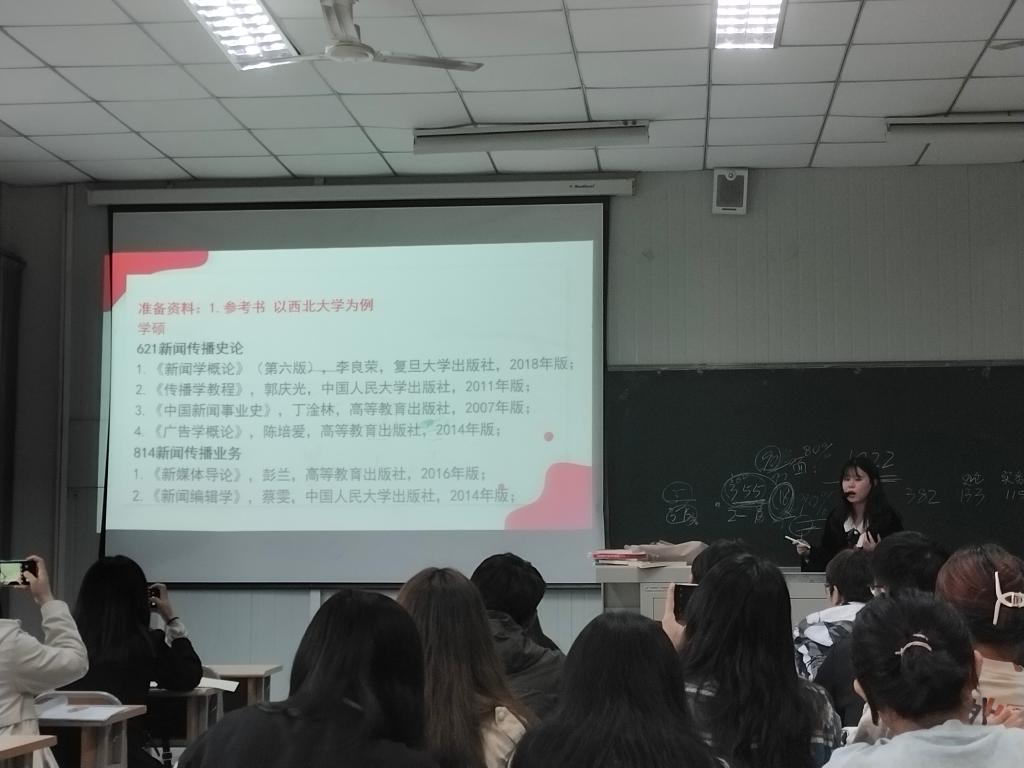 罗老师首先向同学们展示了考研的四次学科评估数据,纵向分析新闻传播学考研的相关公司和专业,重点介绍了包括中国人民大学、中国传媒大学在内的国内知名高校的排名情况,并详细分析了陕西省内几所高校的考研报录情况。关于择校,她建议同学们详细了解考情,根据个人需求做出合理判断,明确个人发展方向,确定考研目标,迈出考研第一步。罗相如在讲座中详细分析了考研实用技巧,包括资料准备、规划进度表时间表,以及如何进行学习成果自我检测等。应现场同学要求,推荐了专业的复习资料和各类考研公众号,并以《新闻学概论》为例,结合自身体会向同学们介绍了四遍读书法、关键词记忆法、艾宾浩斯记忆法等学习方法。随后,罗相如展示了自己在考研期间内各科学习进度表和时间表,希望同学们通过自我检测不断调整进度和时间,找到最适合自己的学习模式,提升学习效率。