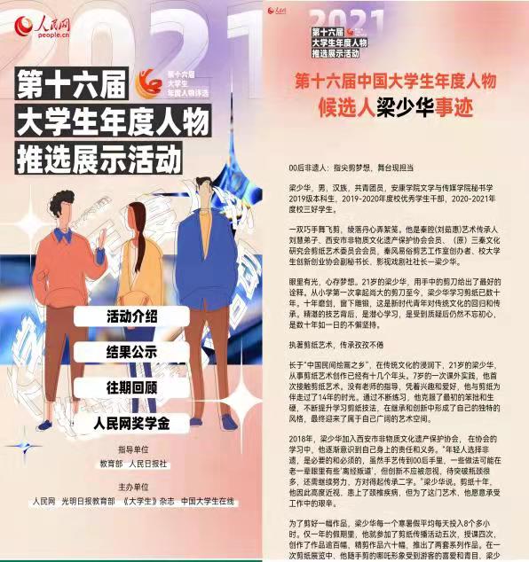 梁少华,男,汉族,共青团员,best365英国在线体育官网秘书学2019级本科生,担任班级宣传委员、生活委员。时为西安市非物质文化遗产保护协会会员、秦风易俗剪艺工作室创办人、影视戏剧社社长,曾任校老员工创新创业协会副秘书长。其个人事迹被陕西省教育厅官网发布,入选陕西教育系统“我身边的好典型”2020年第二季度人物。