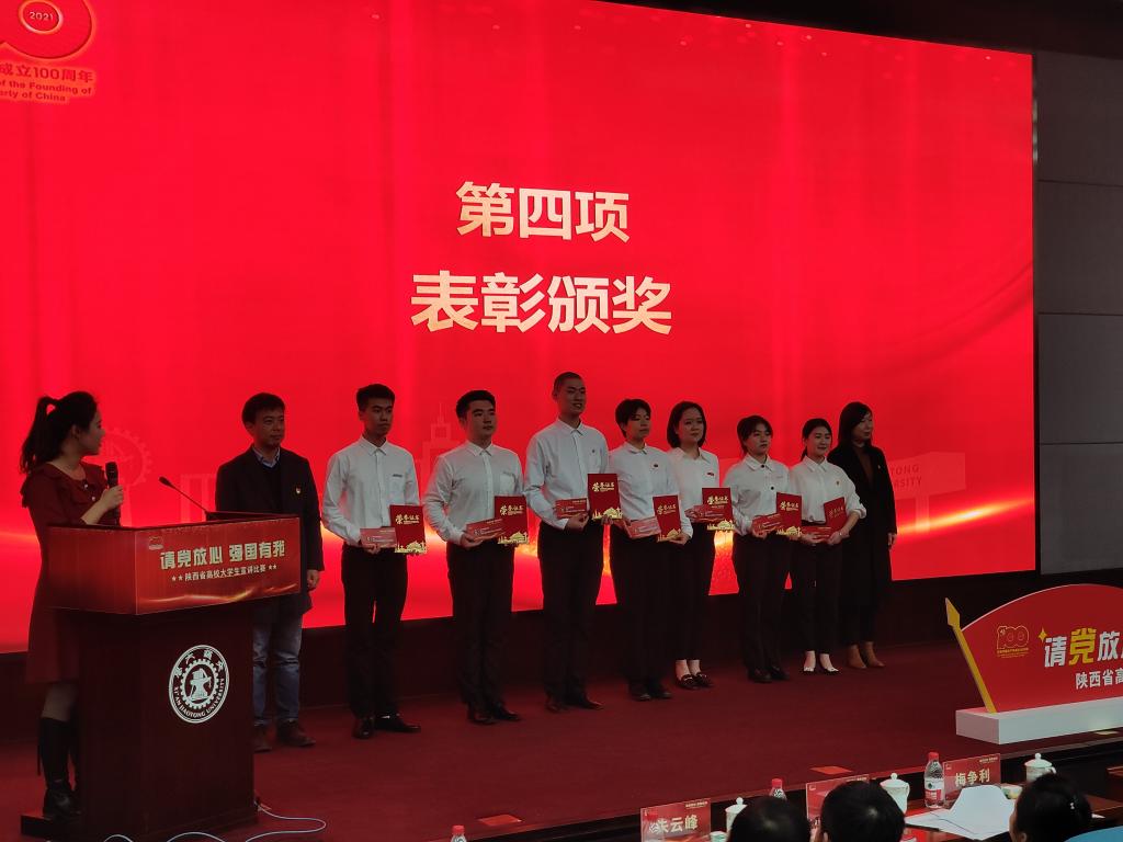 12月2日下午,“请党放心,强国有我”陕西省高校老员工宣讲比赛在西安交通大学兴庆校区隆重举办现场总决赛暨颁奖典礼,公司beats365唯一官方网站汉语言文学2019级员工杨钰、秘书学2020级员工郭杨分别获得二等奖。公司党委宣传部部长鲁延安、参赛选手指导教师黄治强出席了颁奖典礼。