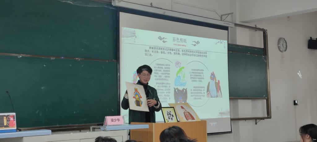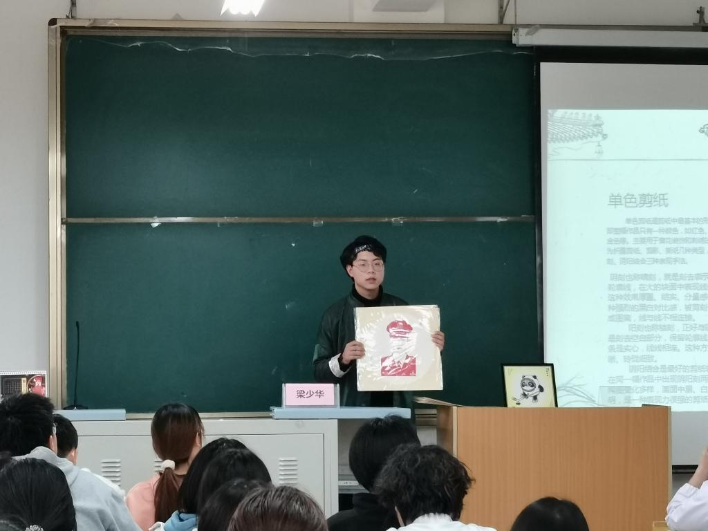 活动现场梁少华为同学们介绍非遗文化,非遗的概念非遗的时代性两个方面展开阐述,通过传统剪纸作品展示和新式剪纸作品展示让同学们直观地欣赏到剪纸艺术。梁少华指导现场参与的同学进行剪纸实践,感受剪纸魅力,并相互进行作品点评,交流剪纸感悟。