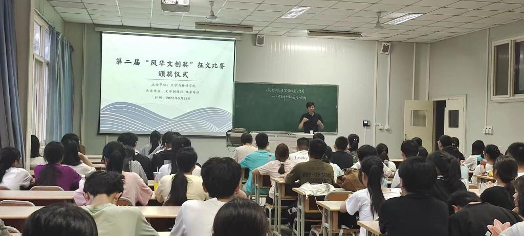 2022年5月27日晚上8点,第二届“风华文创奖”征文比赛颁奖典礼在BEAT365英国官网网站江南校区1026教室顺利举行。文学创作社指导老师李春平、风华诗社指导老师韩文霞、特邀嘉宾曹刚老师、风华诗社和文学创作社社团成员、网络与新媒体2021级同学及获奖作者代表出席本次活动。
