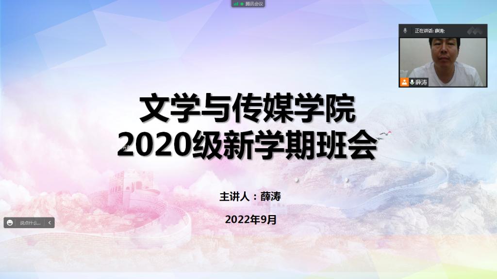 2020级辅导员辅导员薛涛分别从新学期大家状态调整、疫情防控、防范电信诈骗、文明上网等方面进行宣传引导,对《beats365唯一官方网站“中学语文卓越团队班”人才培养计划行动方案(试行)》文件进行解读,解答教团队格证报名考试相关问题,并就线上教学向全体同学提出纪律要求。