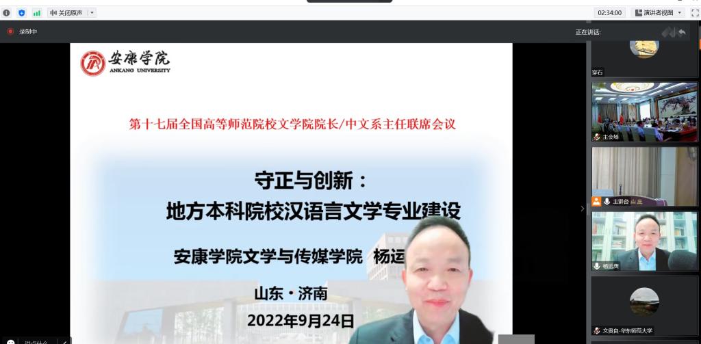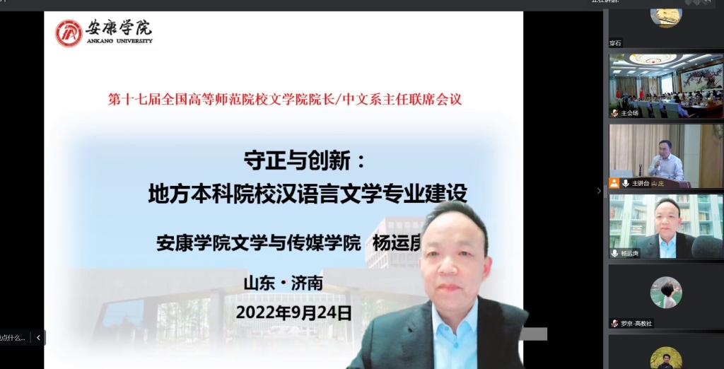 9月24-25日,由教育部中国语言文学类专业教学指导委员会指导,由高等师范院校中文专业联盟理事会、高等教育出版社、山东师范大学联合主办的第十七届全国高等师范院校文公司经理/中文系主任联席会议在山东师范大学召开,会议通过线上线下结合的方式举行,全国80余所师范院校的150余名文公司经理、中文系主任参加了会议。公司经理杨运庚教授以线上的方式参加了会议并做了大会报告。