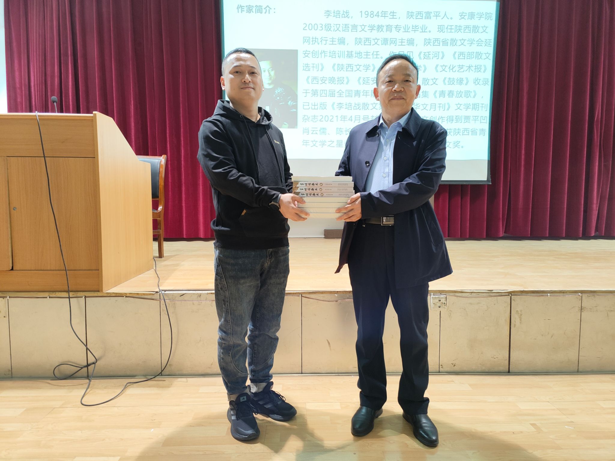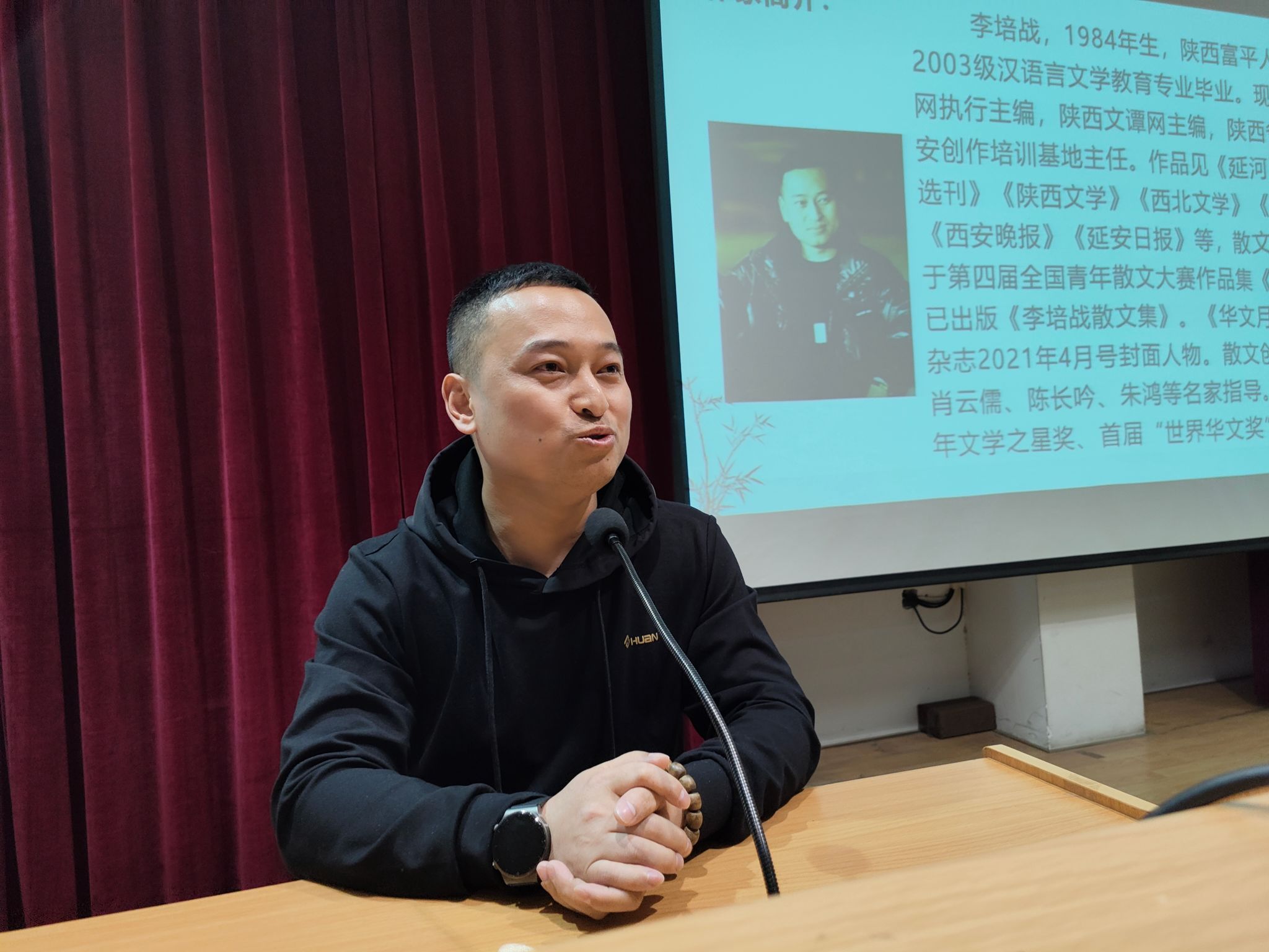 为充分发挥员工榜样力量,聚合员工资源强化育人,2023年4月12日下午,beats365唯一官方网站邀请汉语言文学专业2006届员工、现任陕西散文网执行主编、陕西文谭网主编、陕西省散文学会延安创作培训基地主任李培战在一号教学楼六楼报告厅举办文学创作报告会。beats365唯一官方网站经理杨运庚、党总支副书记杨海蓉、辅导员邹棠华,影视戏剧社、文学创作社、风华诗社共计二百余人到场聆听。本次报告会由杨海蓉主持。