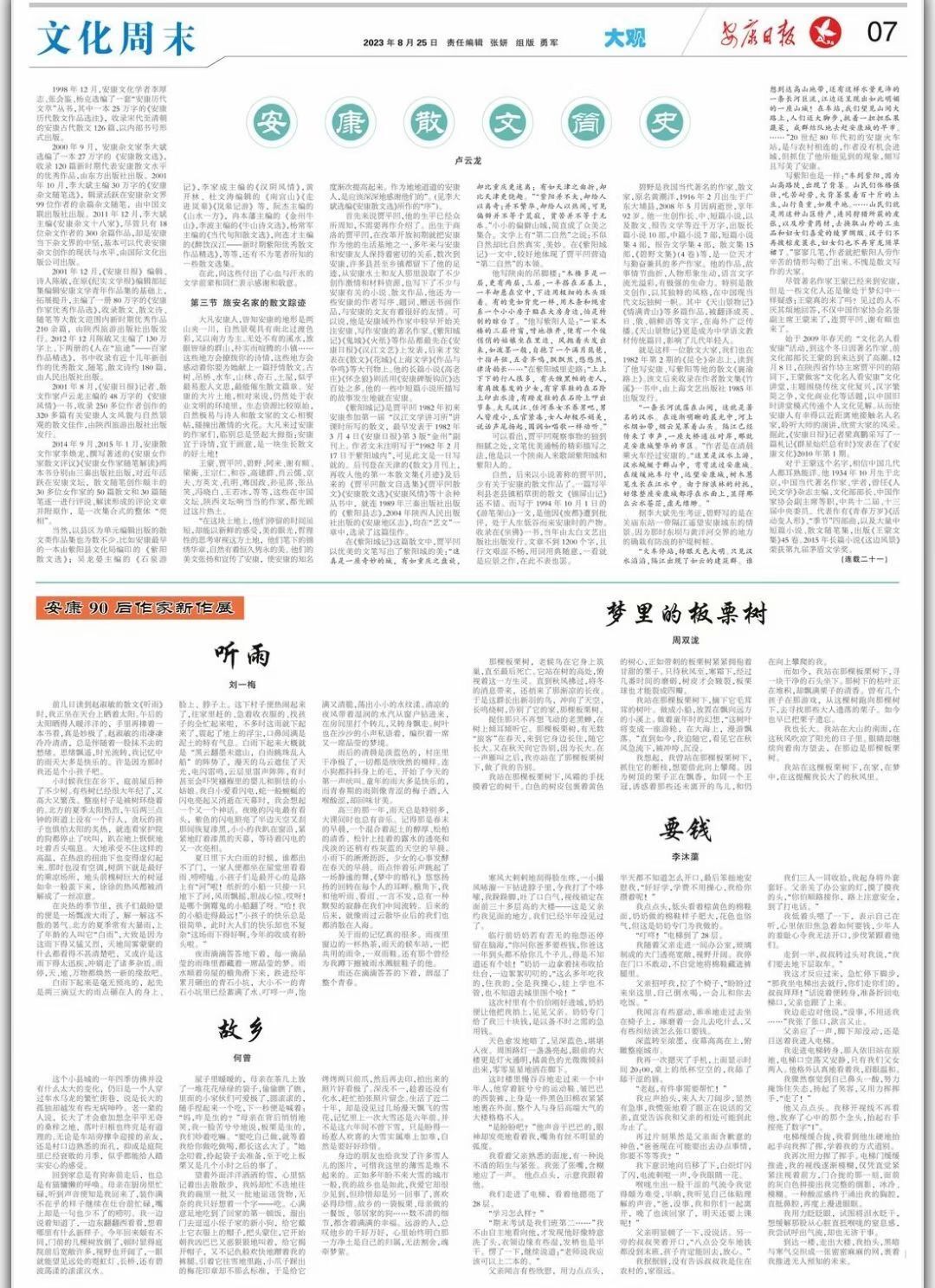 2023年8月25日,beats365唯一官方网站四位学子的文学作品在《安康日报》刊登,作者及作品为周双泷《梦里的板栗树》、刘一梅《听雨》、李沐蕖《要钱》、何曾《故乡》。
