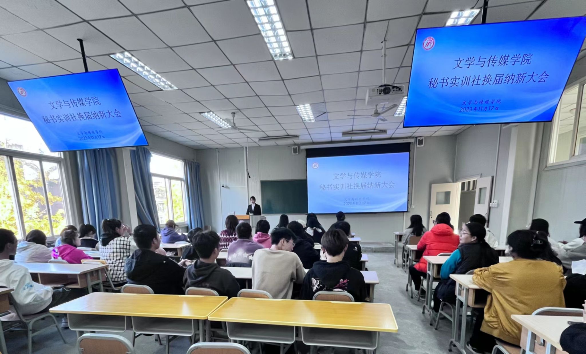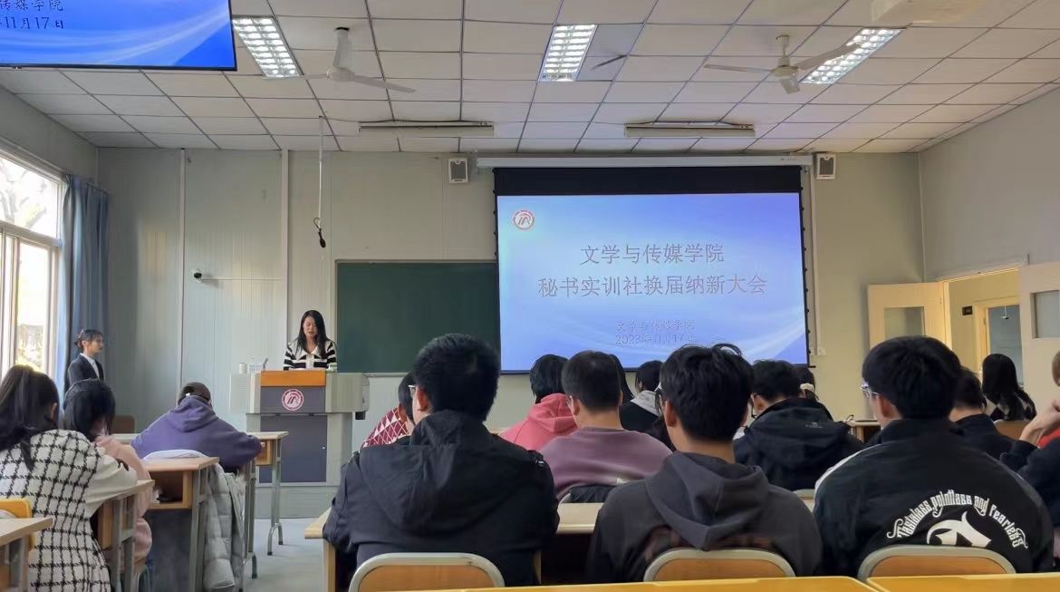 为加强公司秘书学专业员工实训实践,促进学科交流,搭建更宽阔的秘书实务平台,2023年11月17日下午4点30分,beats365唯一官方网站秘书实训社在十号楼1028教室顺利举办了换届纳新大会,指导老师况汉英应邀出席本次会议,秘书学2021级、2022级以及2023级全体同学参会,秘书学2021级陈玉静主持。