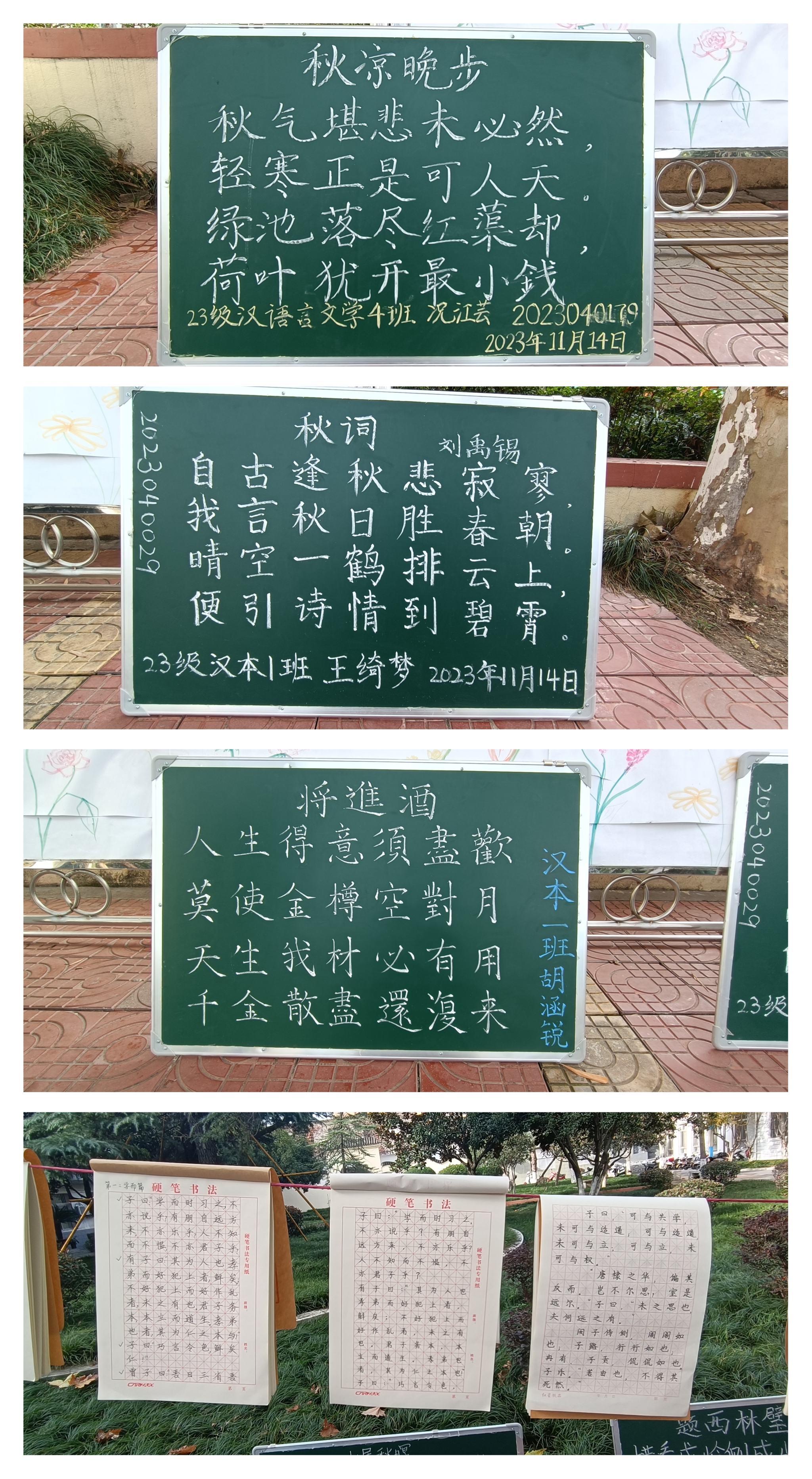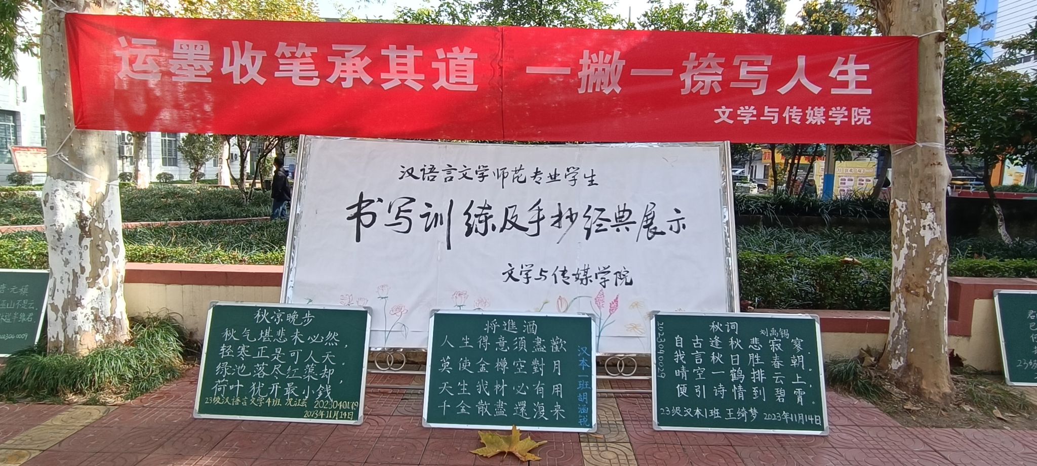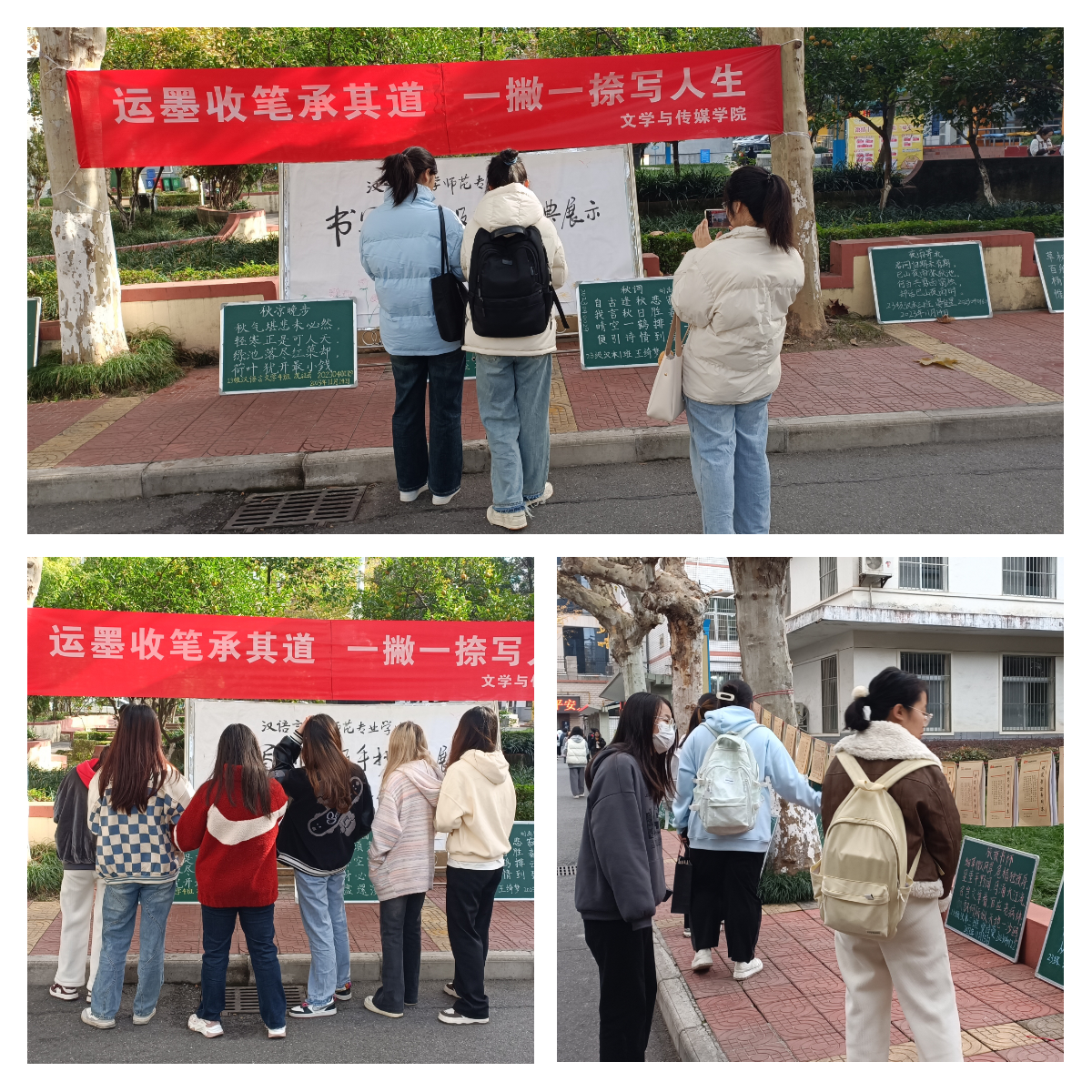 导航痕迹 首页 > 新闻通知 > beats365唯一官方网站新闻 > 正文 beats365唯一官方网站新闻 通知公告 运墨收笔承其道,一撇一捺写人生——beats365唯一官方网站举办书写作品展示活动 来源:beats365唯一官方网站 发布日期:2023年11月24日 阅读次数: 为了弘扬中华优秀传统文化,提高汉语言文学师范专业员工的书写水平,促进同学们相互学习共同进步的良好学风,11月中旬,我院组织举办2023级汉语言文学专业师范生板书训练及手抄经典展示活动。活动主题为“运墨收笔承其道,一撇一捺写人生”。 江南校区林荫道旁,摆放整齐的粉笔字小黑板,树荫下随风飘扬的硬笔手抄经典《论语》,这些呈现的作品以汉字为载体,通过线条的流动和字形的变化,一撇一捺间的力量和韵律,散发着汉字独有的魅力和浓郁的文化氛围。一幅幅精美的板书作品、一本本工整的手抄经典吸引往来师生的驻足和赞叹。 本次书写展示活动不仅弘扬了中华优秀传统文化,激发了同学们对文字书写的热情,坚定了同学们规范书写汉字,养成良好书写习惯的信心,也让同学们感受到了中华优秀传统文化的魅力所在,增强了文化自信,得到了全校师生的一致好评。 撰稿/苏虹 李健君 摄影/员工 审校/杨海蓉 发布/崔瑜