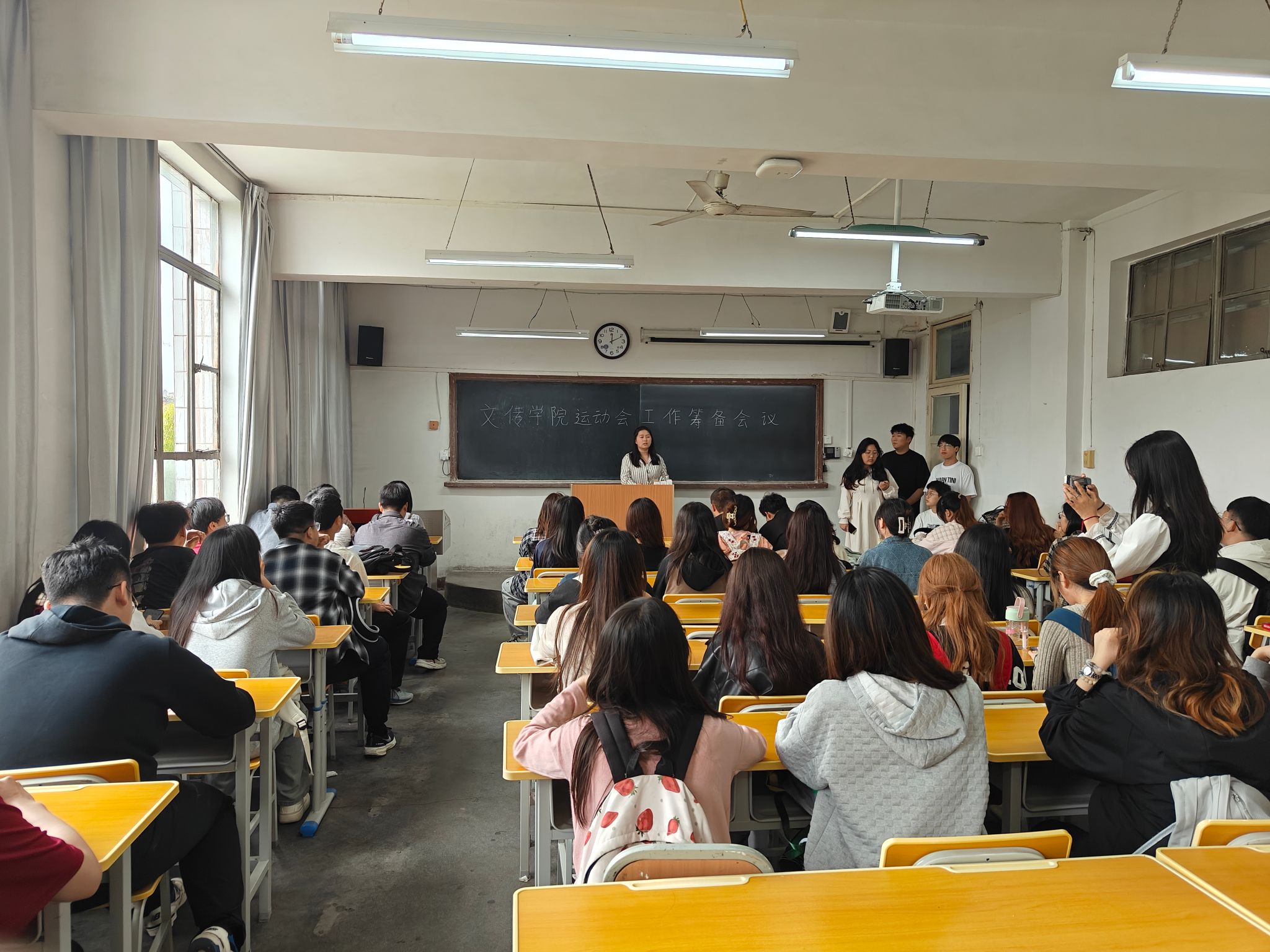 根据公司的整体部署,学工班主任薛涛就本届运动会做了具体的分工安排,并嘱咐员工会及各班班长明确各职能部门的职责分工,通力合作,助力运动员顺利完赛并取得好成绩。辅导员许明强调了运动会期间的纪律问题,希望员工干部要积极发挥带头作用,做好运动会期间服务工作,希望院员工分会各部门与各班齐心协力,提质增效,展现文传学子风采。