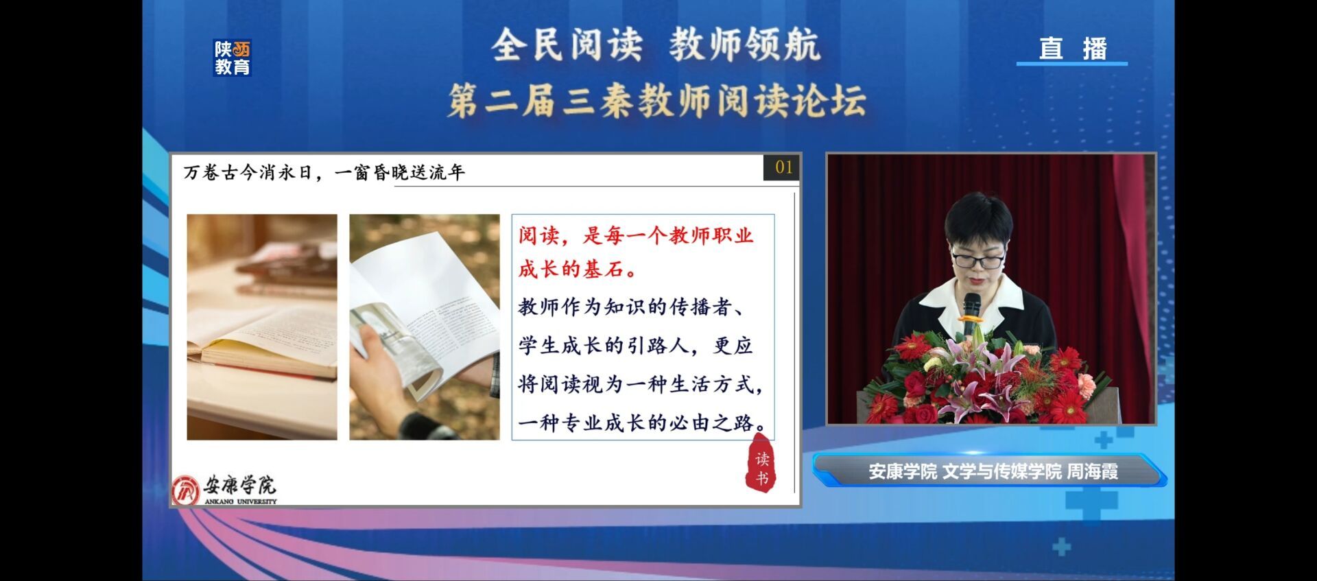 4月27日,由中共陕西省委教育工委和陕西省教育厅指导的“全民阅读 教师领航·第二届三秦教师阅读论坛”陕南专场在安康市第一小学隆重举行。该论坛由陕西学前师范公司与陕西教育报刊社共同主办,best365英国在线体育官网和陕西省中小学幼儿园教师发展中心共同协办。论坛旨在展现陕西教师群体阅读经验,分享陕西教育阅读工作经验智慧,弘扬践行“教育家精神”,引领全省中小学教师争做新时代好老师,为推动全民阅读凝聚三秦教师群体力量。来自西安、延安、汉中、安康的9名专家在论坛现场做了专题分享报告,安康市六百余名中小学教师现场参会学习,两万余名教师线上观看同步直播。