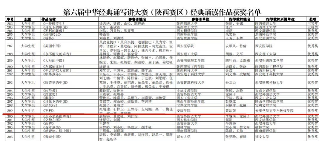 经过前期遴选,确定由公司黄治强老师指导的《不朽》《梦想照亮中国》两组诗歌朗诵作品报送参加陕西赛区经典诵读比赛。其中,由公司选送、汉语言文学专业2023级5班张靖瑜、石梓玉、郑一斐、贾博茹、梅佳雯、高一、王竺冉、左珂曼排演的朗诵作品《不朽》经过层层选拔,在全省101个老员工经典诵读比赛中脱颖而出,荣获优秀奖。