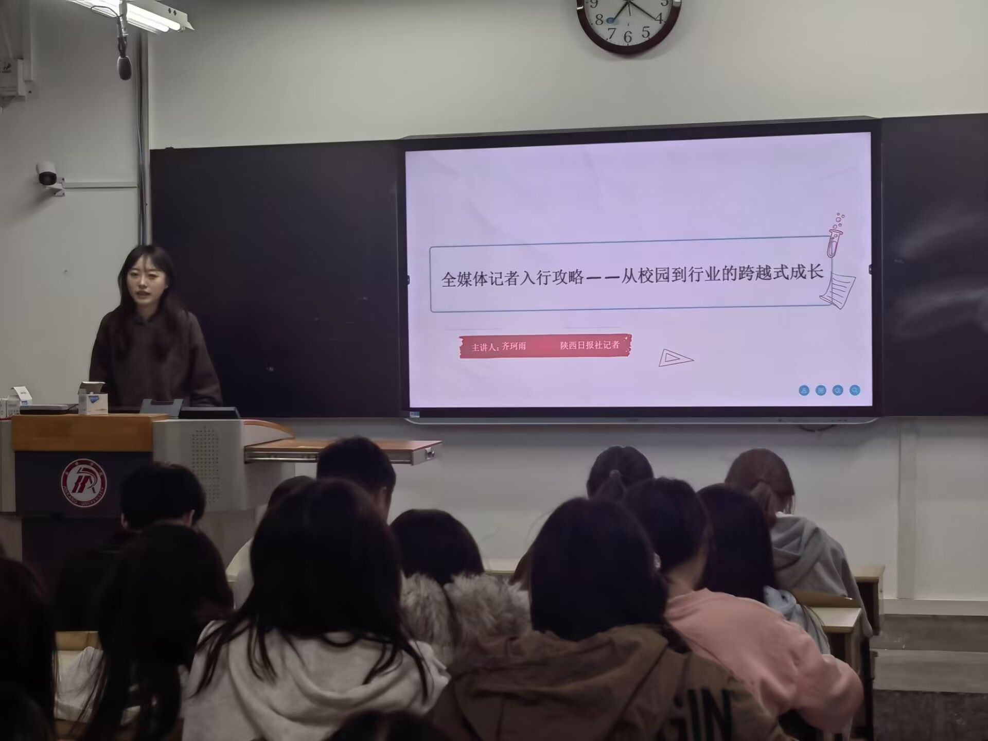 3月27日,秘书与新媒体系于1311教室成功举办网络与新媒体专业《行业企业问题讲座》第三讲。本次讲座特邀陕西日报社记者齐珂雨为2022级全体同学剖析当前媒体行业现状,分享成为全媒体新闻工作人才的成长攻略