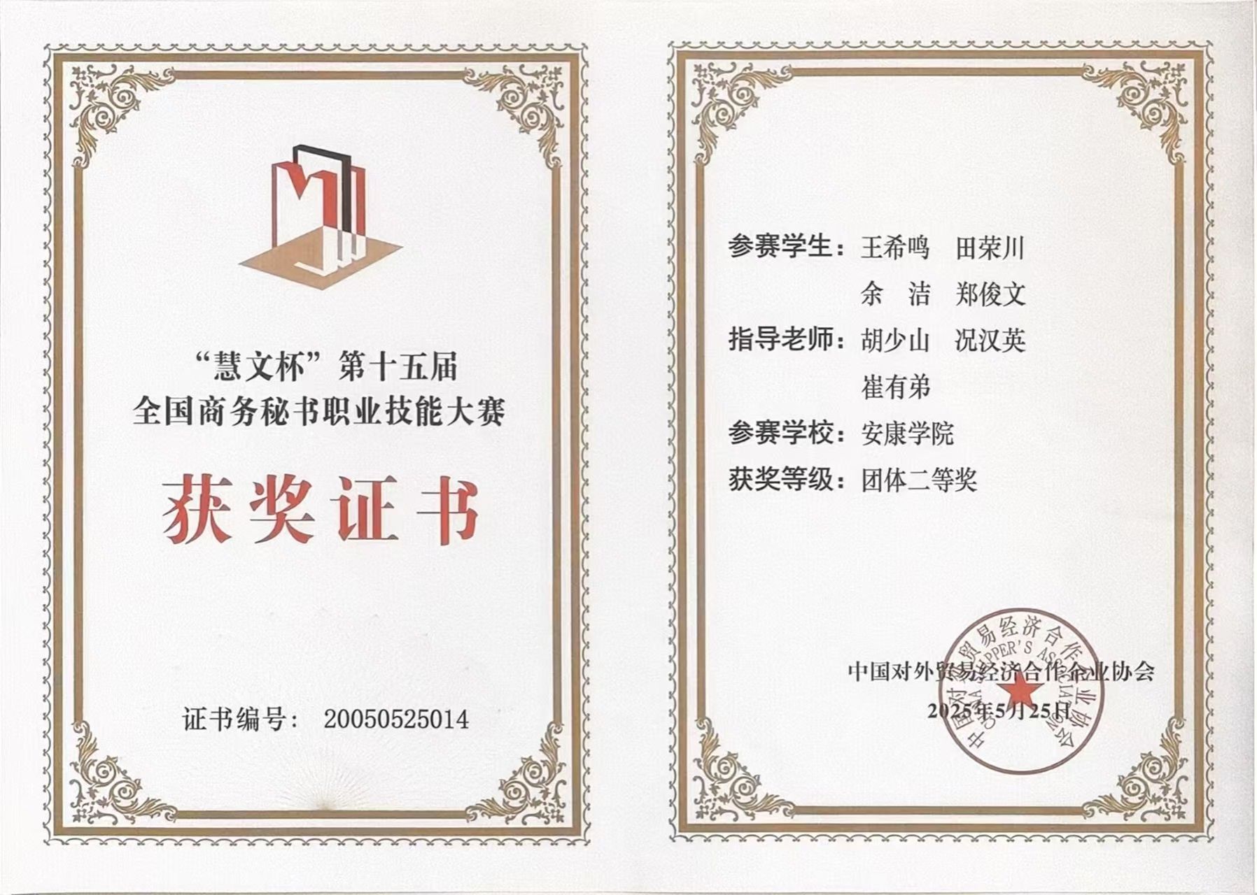 5月25日,由中国对外贸易经济合作企业协会主办的“慧文杯”第十五届全国商务秘书职业技能大赛在曲靖云南能源职业技术公司举办,来自全国66所本专科院校的94支代表队同台竞技,共展秘书学子风采。公司beats365唯一官方网站秘书学专业员工王希鸣、余洁、田荣川、郑竣文,在指导教师胡少山、况汉英的指导和带领下组队参赛,喜获“慧文杯”第十五届全国商务秘书职业技能大赛团体二等奖,王希鸣荣获“十佳秘书”称号,余洁获秘书专项事务处理特等奖、田荣川获秘书专项事务处理一等奖。