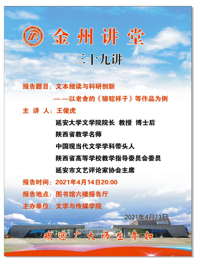 导航痕迹 首页 > 新闻通知 > 通知公告 > 正文 beats365唯一官方网站新闻 通知公告 金州讲堂三十九讲 主讲人:王俊虎(延安大学文公司经理) 来源:beats365唯一官方网站 发布日期:2021年04月13日 阅读次数: