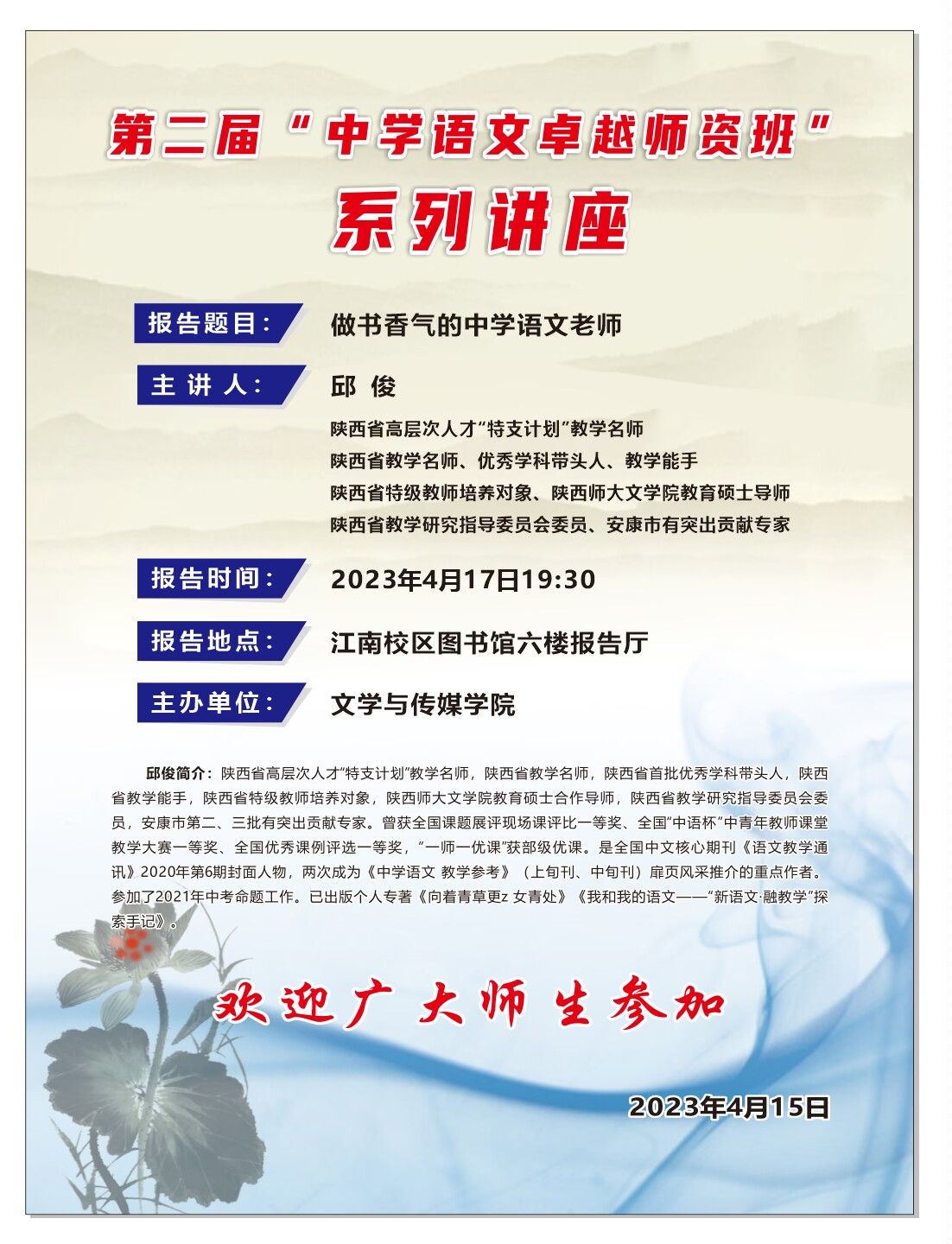 导航痕迹 首页 > 新闻通知 > 通知公告 > 正文 beats365唯一官方网站新闻 通知公告 第二届“中学语文卓越团队班”系列讲座 来源:beats365唯一官方网站 发布日期:2023年04月15日 阅读次数: