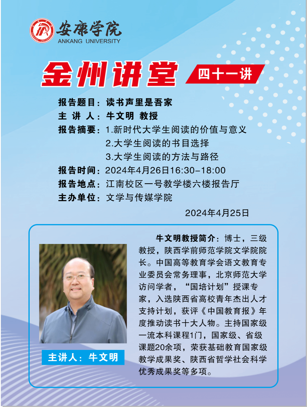 导航痕迹 首页 > 新闻通知 > 通知公告 > 正文 beats365唯一官方网站新闻 通知公告 金州讲堂四十一讲 主讲人:牛文明(陕西学前师范公司文公司经理) 来源:beats365唯一官方网站 发布日期:2024年04月24日 阅读次数: