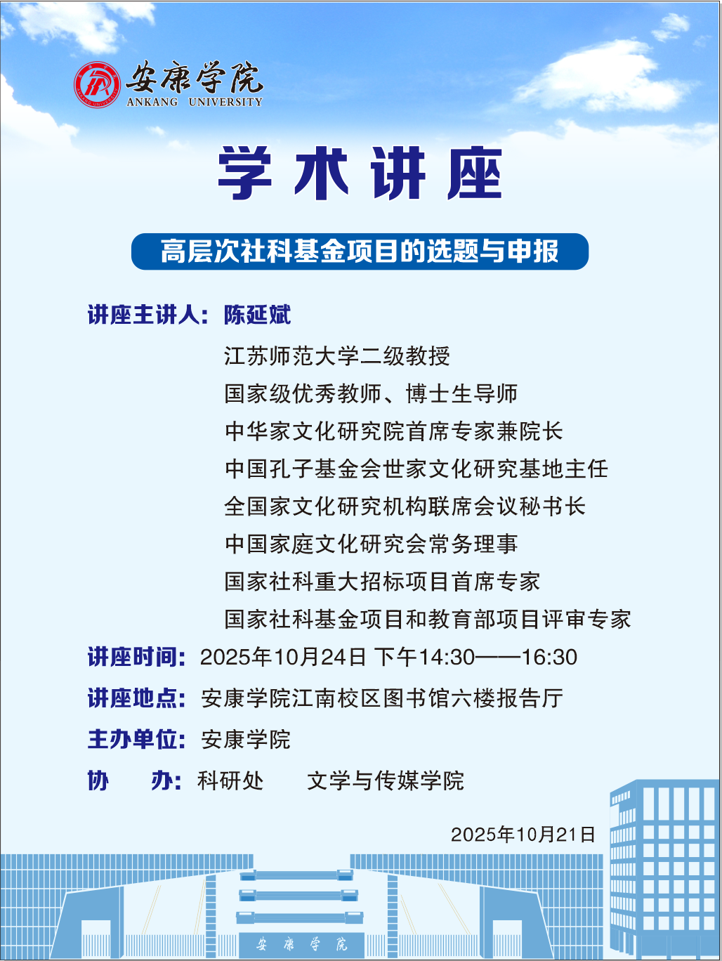 导航痕迹 首页 > 新闻通知 > 通知公告 > 正文 beats365唯一官方网站新闻 通知公告 学术讲座预告:高层次社科基金项目的选题与申报 来源:beats365唯一官方网站 发布日期:2025年10月21日 阅读次数: