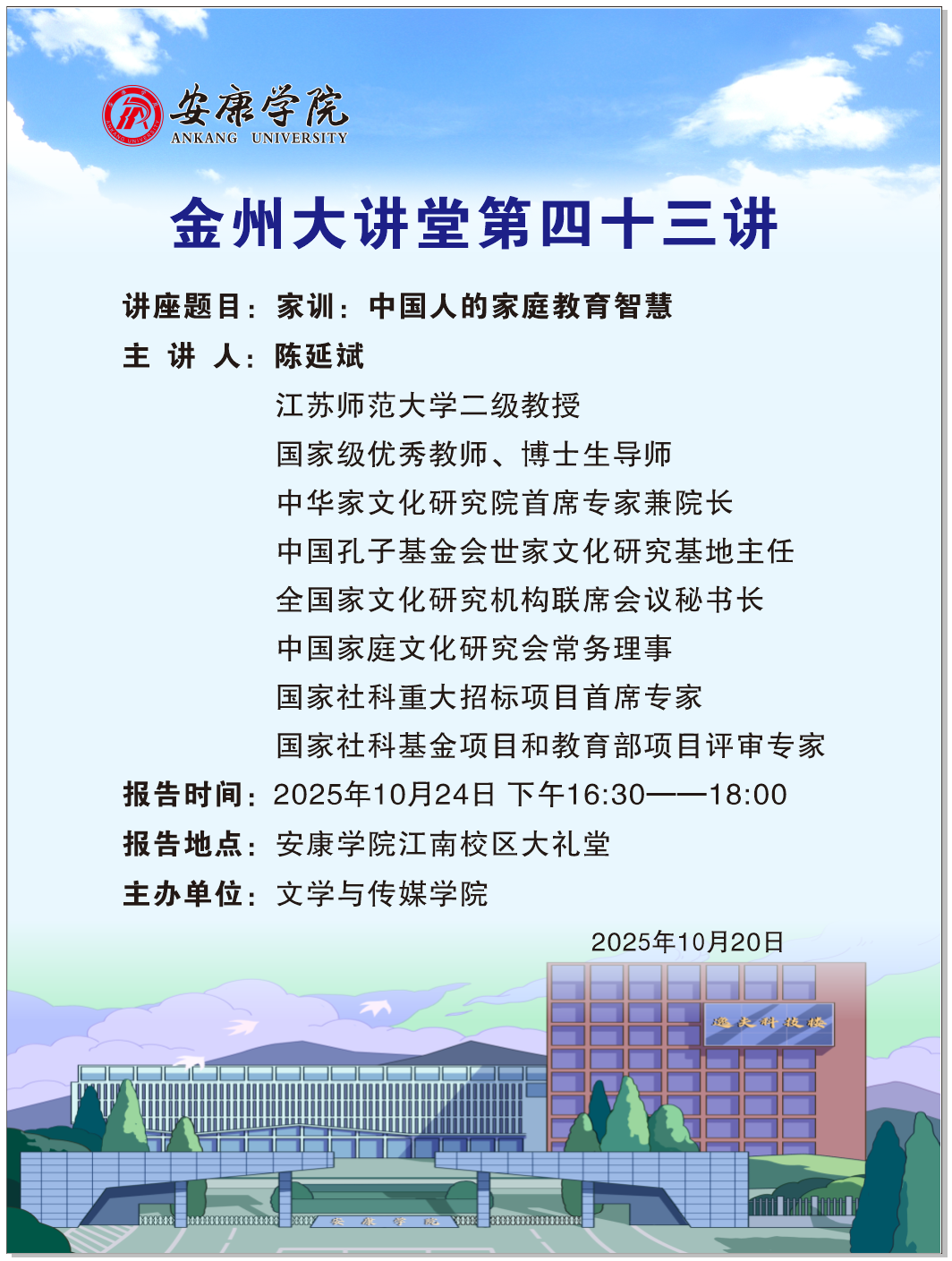 导航痕迹 首页 > 新闻通知 > 通知公告 > 正文 beats365唯一官方网站新闻 通知公告 金州大讲堂第四十三讲(主讲人:陈延斌 江苏师范大学二级教授) 来源:beats365唯一官方网站 发布日期:2025年10月21日 阅读次数: