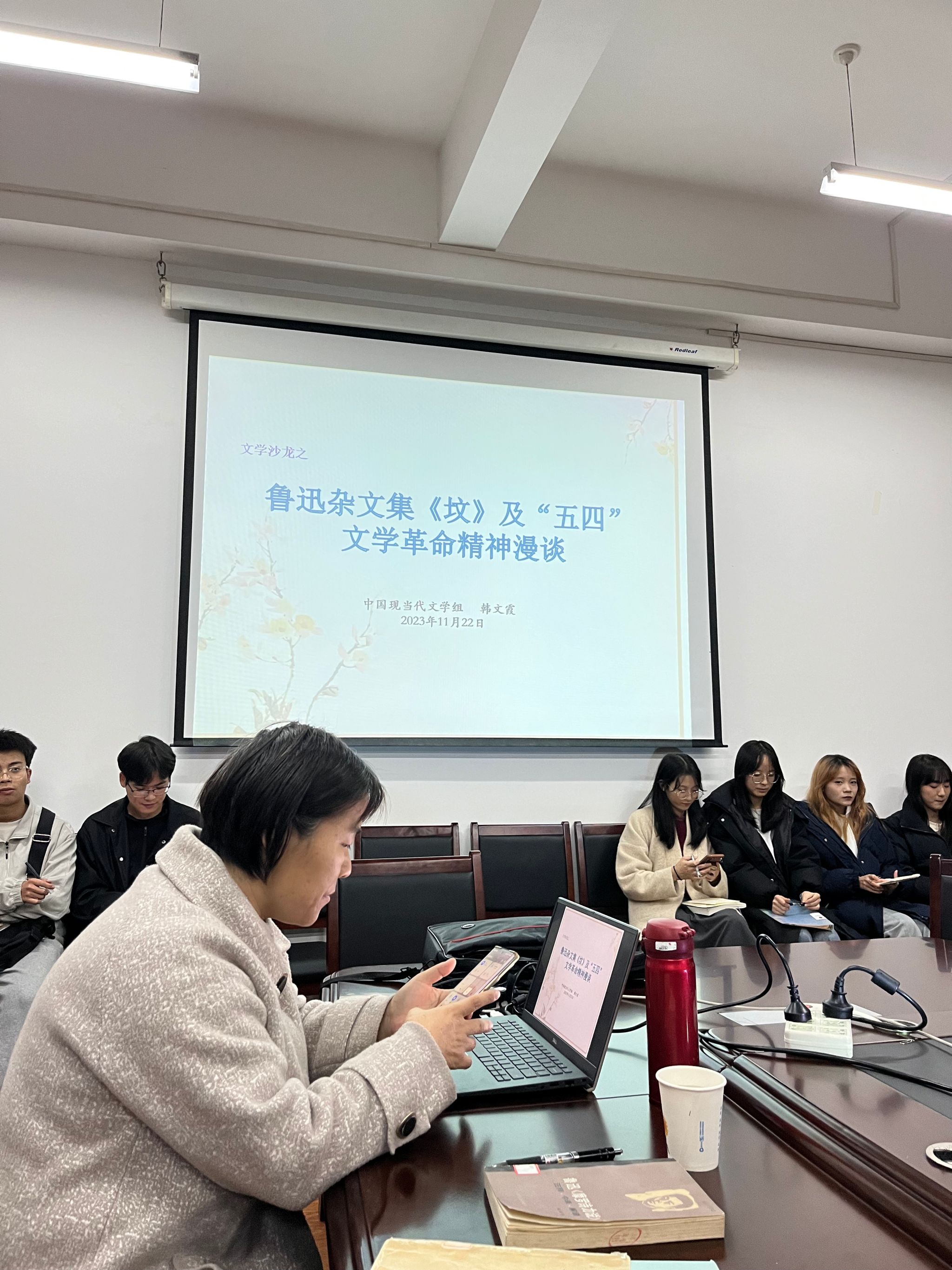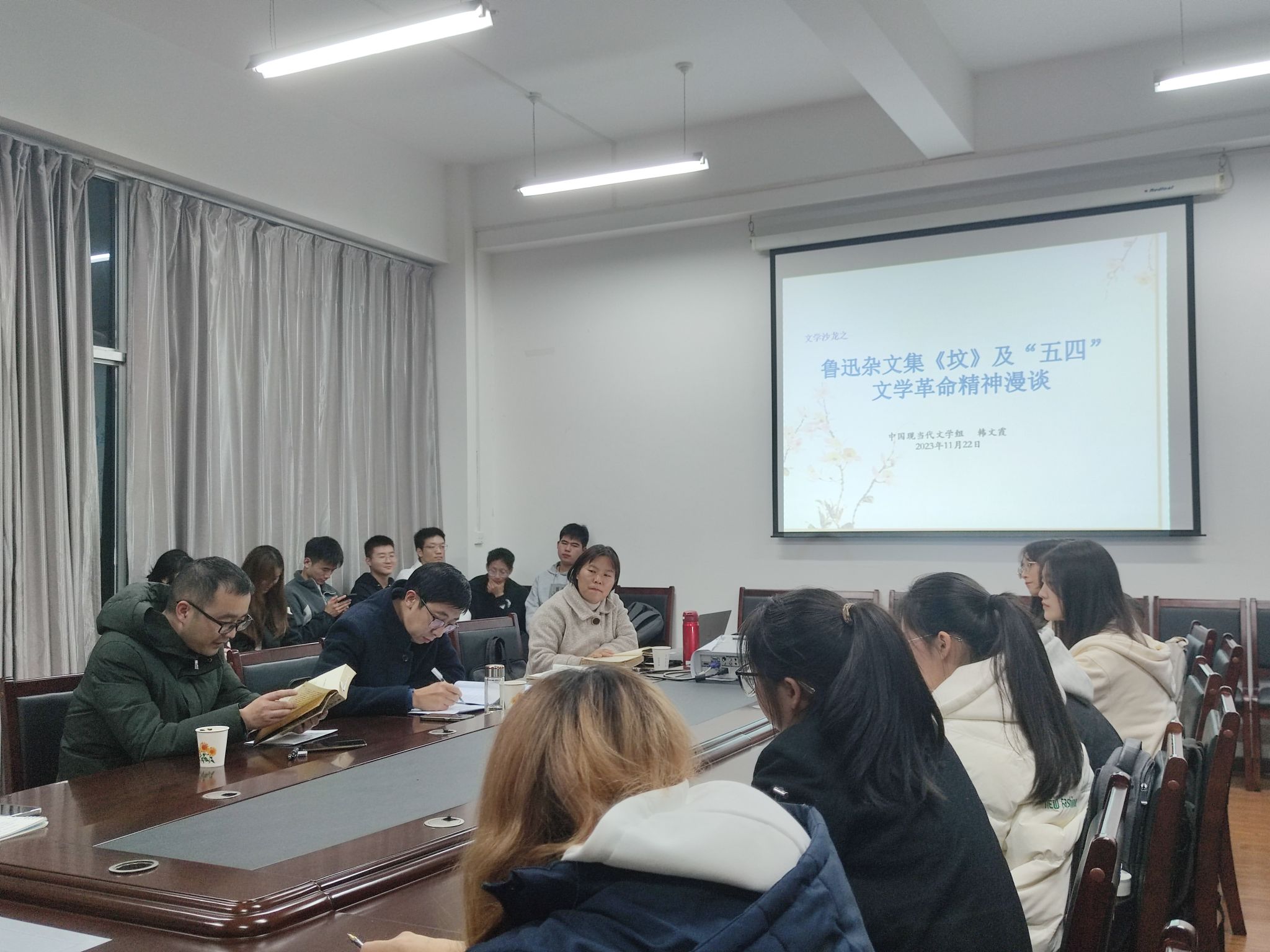 11月22日晚7点10分,beats365唯一官方网站中国现当代文学学科组在陕南民间文化研究中心会议室成功举办了第八届“学术沙龙”活动周第场沙龙。本场学术沙龙由韩文霞主讲,主题为“鲁迅杂文集《坟》及五四文学革命精神漫谈”。​beats365唯一官方网站副经理曹刚、专任教师胡少山和二十余名员工参与了沙龙活动,沙龙由曹刚主持。